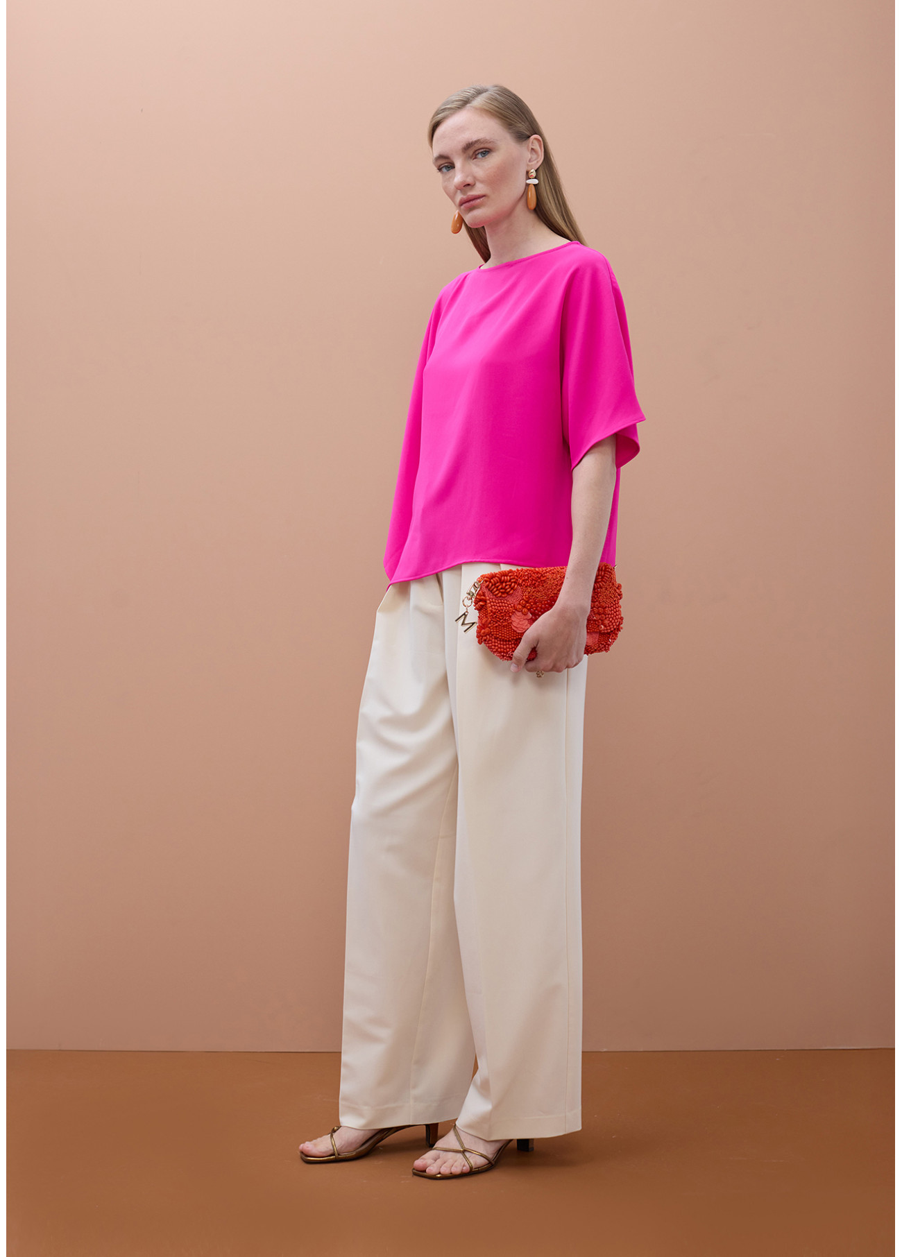 Blusa suelta estilo capa con mangas caídas. Confeccionada en tejido suave y ligero, esta prenda ofrece un diseño asimétrico en vibrante color fucsia. Ideal para dar un toque moderno a tu look diario.