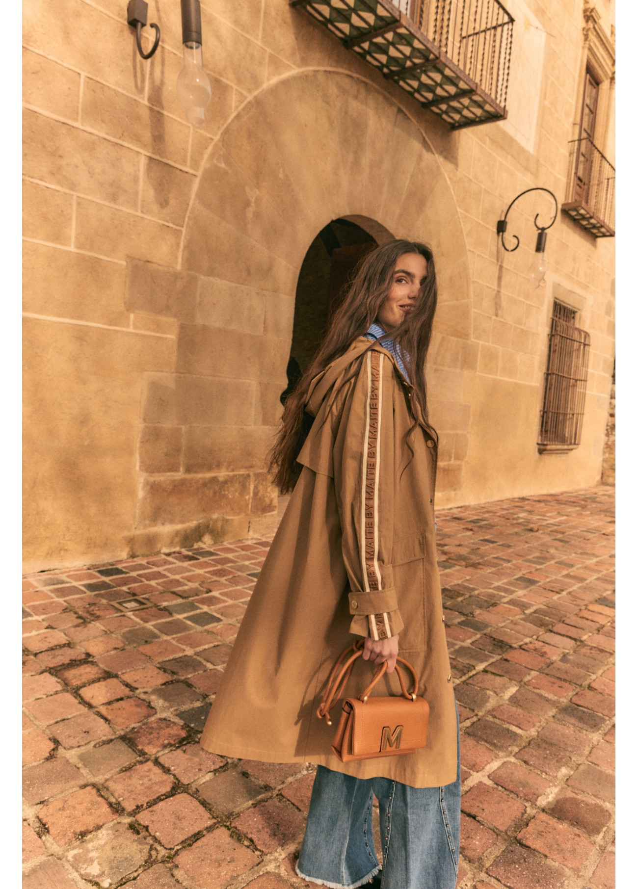 Trench coat oversize en tono camel con cintas personalizadas a lo largo de las mangas. Diseño clásico con cierre de botones, capucha y bolsillos laterales. Ideal para un look urbano y contemporáneo. Perfecto para el entretiempo, combinando estilo y funcionalidad.
