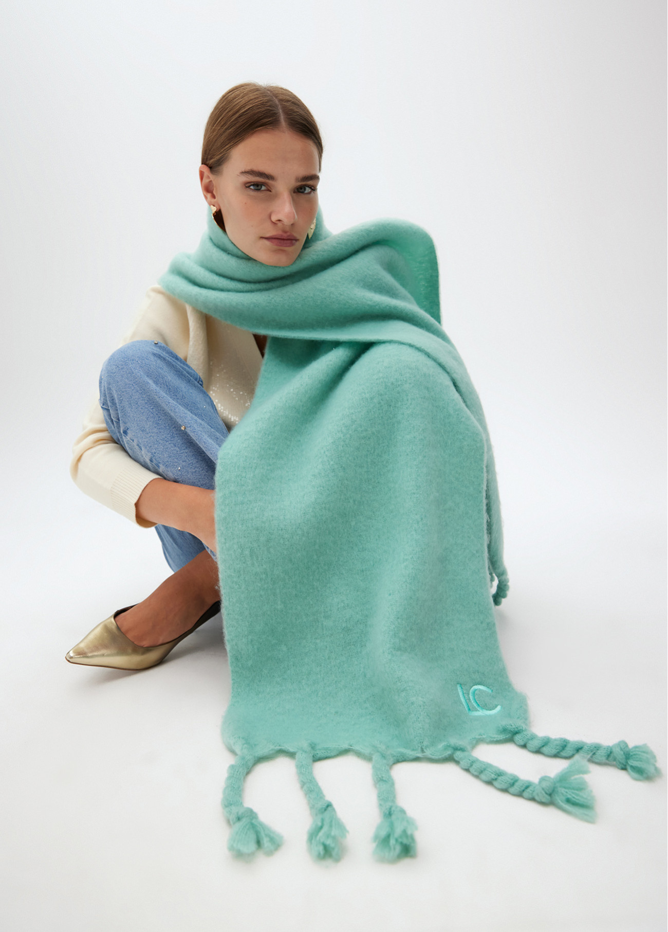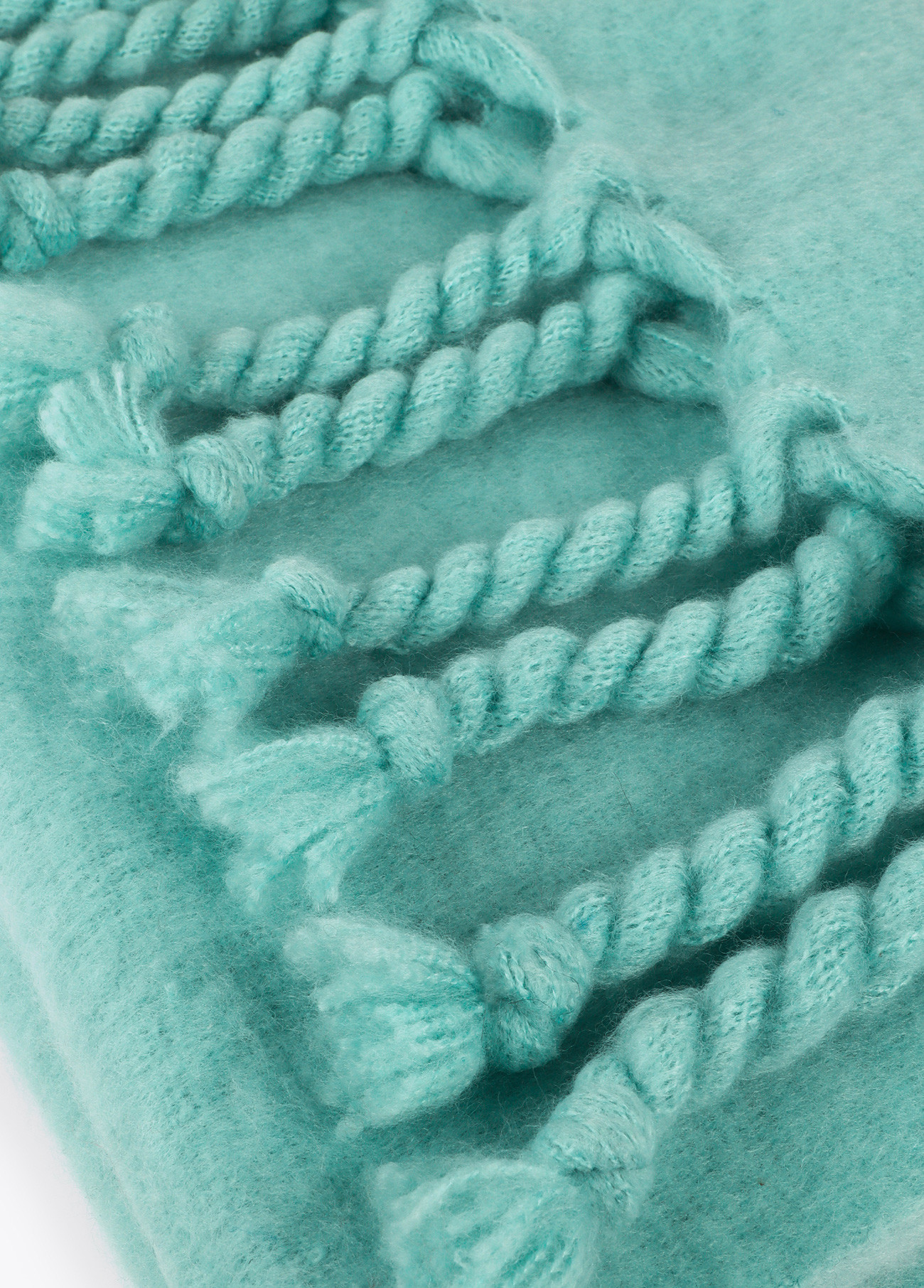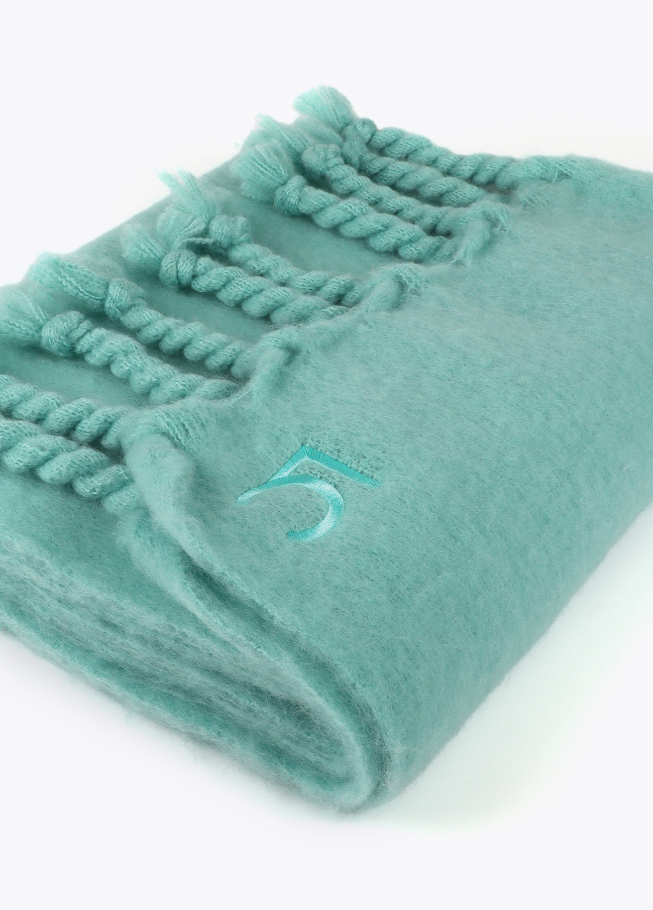 Bufanda suave de diseño liso en color turquesa. Confeccionada en tejido de alta calidad, presenta flecos gruesos en los extremos y el logo bordado. Amplia y cálida, ideal para mantener el confort durante el invierno.