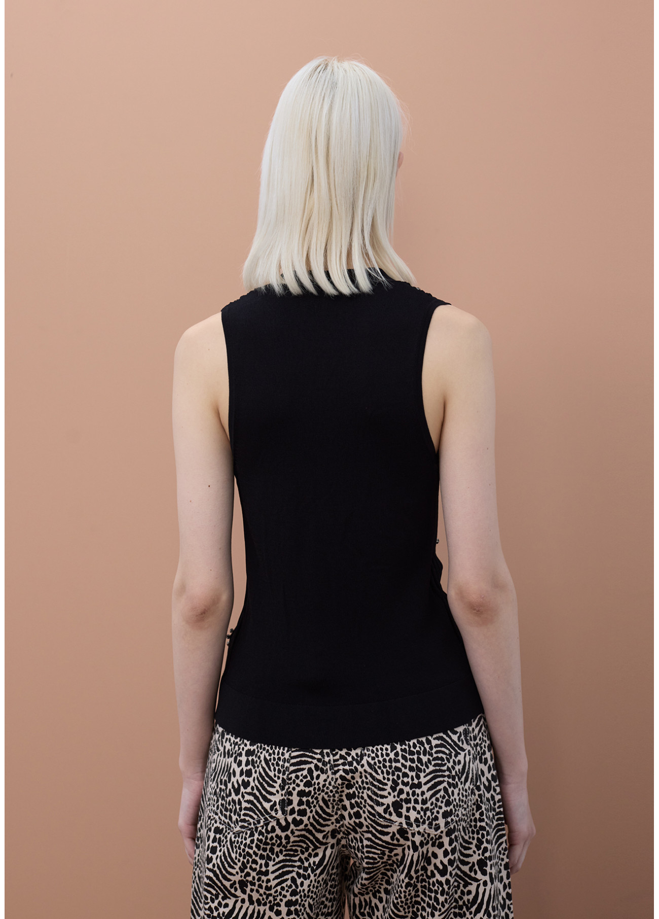 Top sin mangas estilo cardigan con botones frontales y adornos de joyas. Tejido acanalado para un ajuste cómodo y elegante. Perfecto para crear looks sofisticados con un toque de glamour.