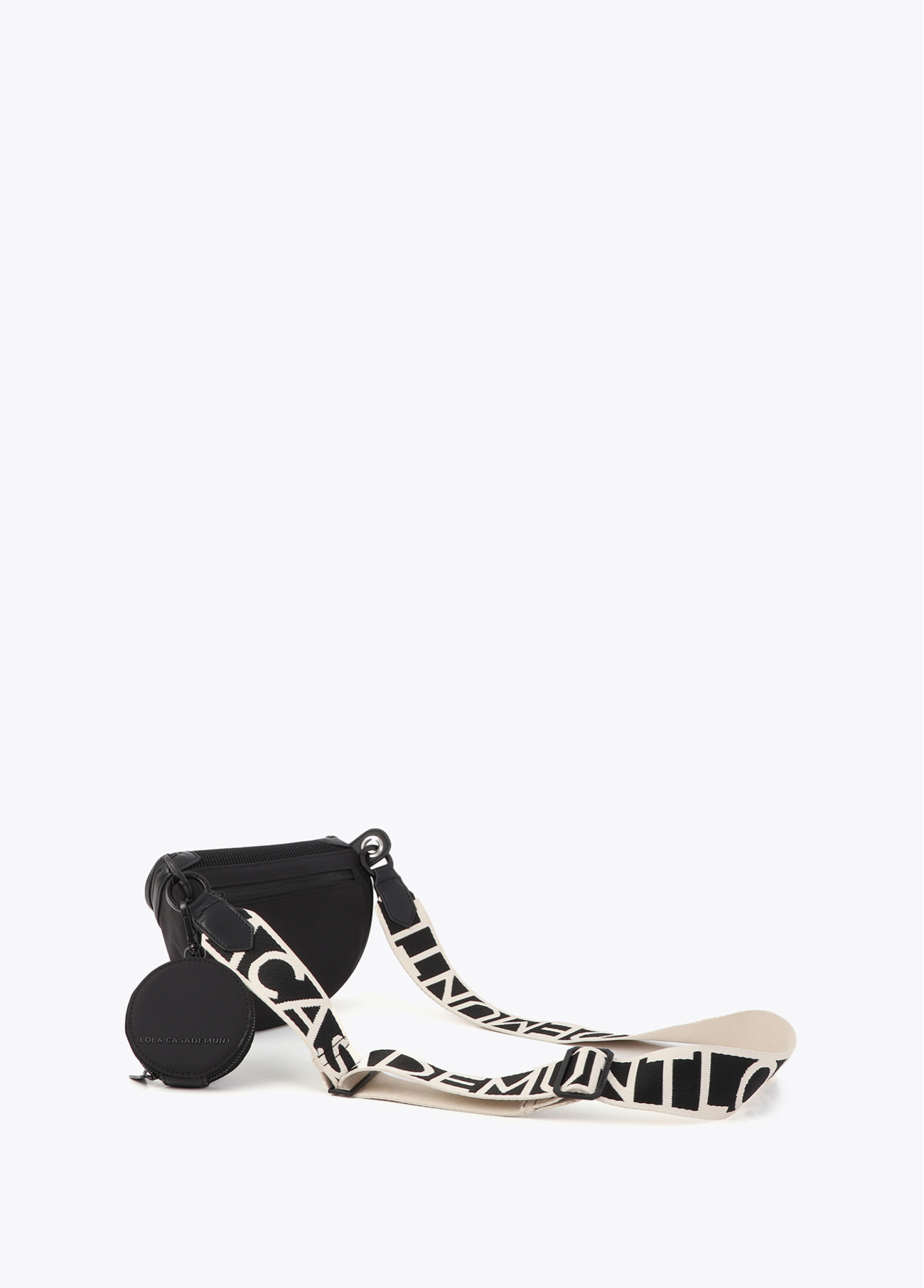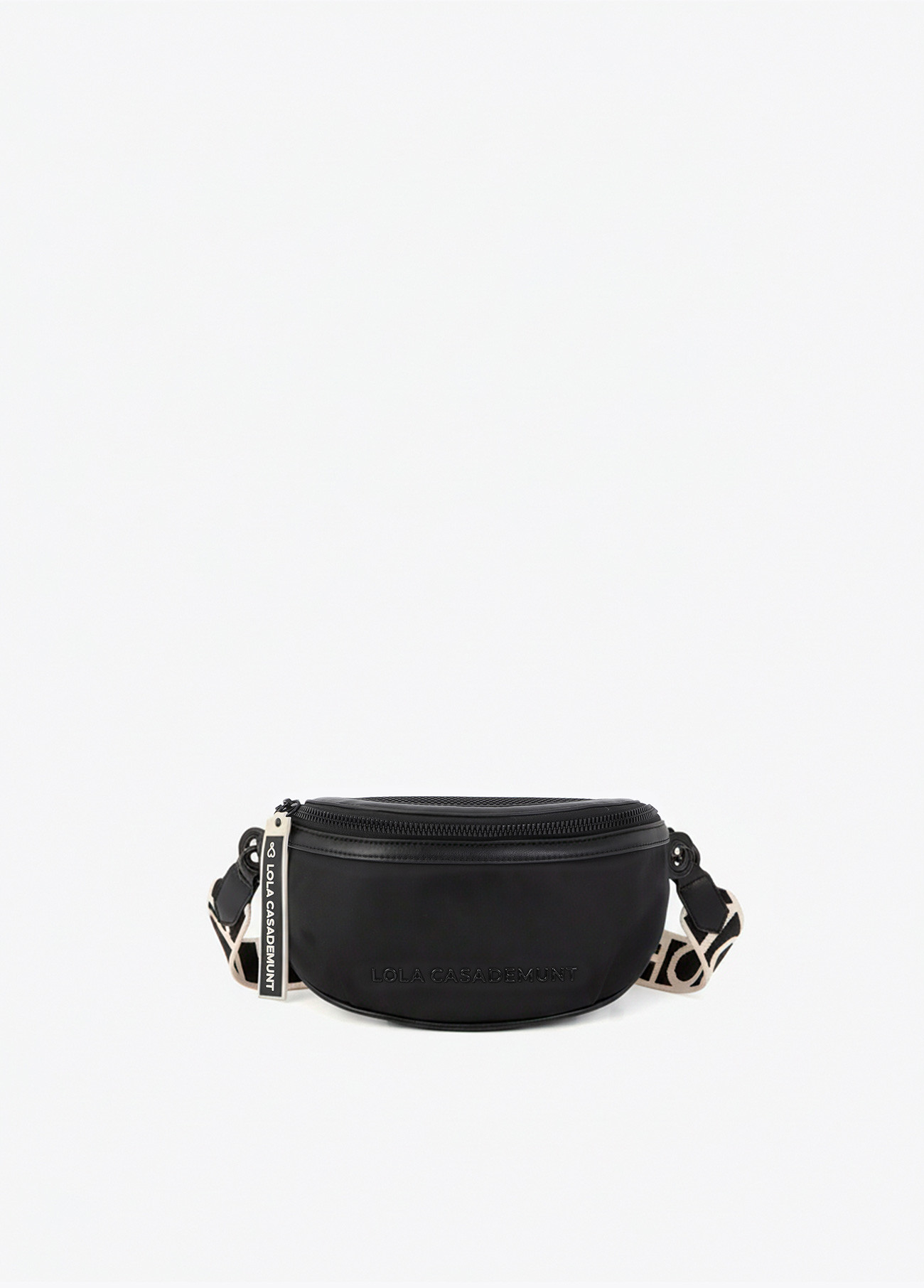 Riñonera versátil de nylon negro, perfecta como bandolera. Con cierre de cremallera, bolsillo exterior y logo destacado. Cómoda correa ajustable para llevar al hombro o cintura.