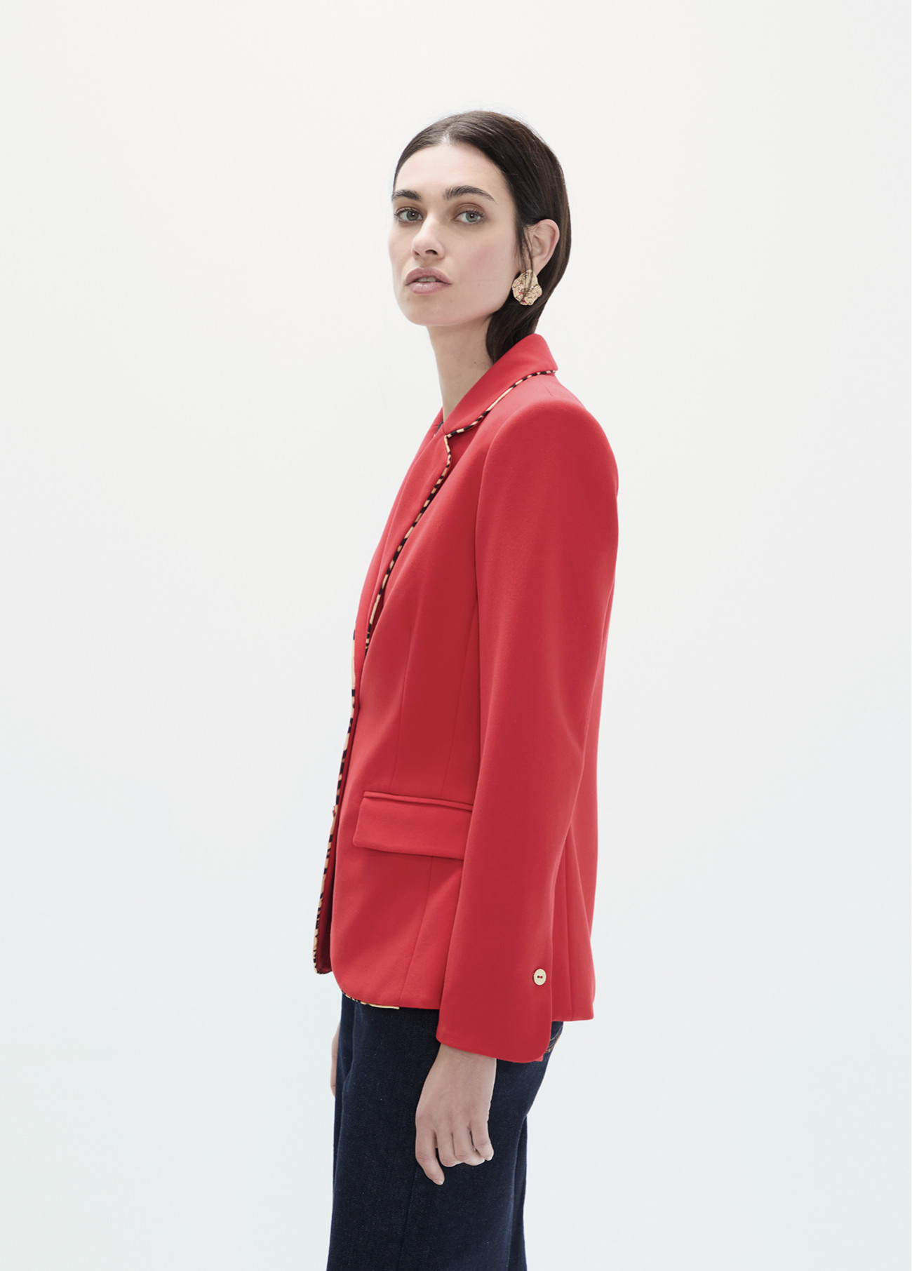 American color rojo con vivo estampado animal a contraste. Botones dorados en frontal y manga y bolsillos con tapeta. Ideal para tu dia a dia y para ocasiones especiales con un toque original y elegante.