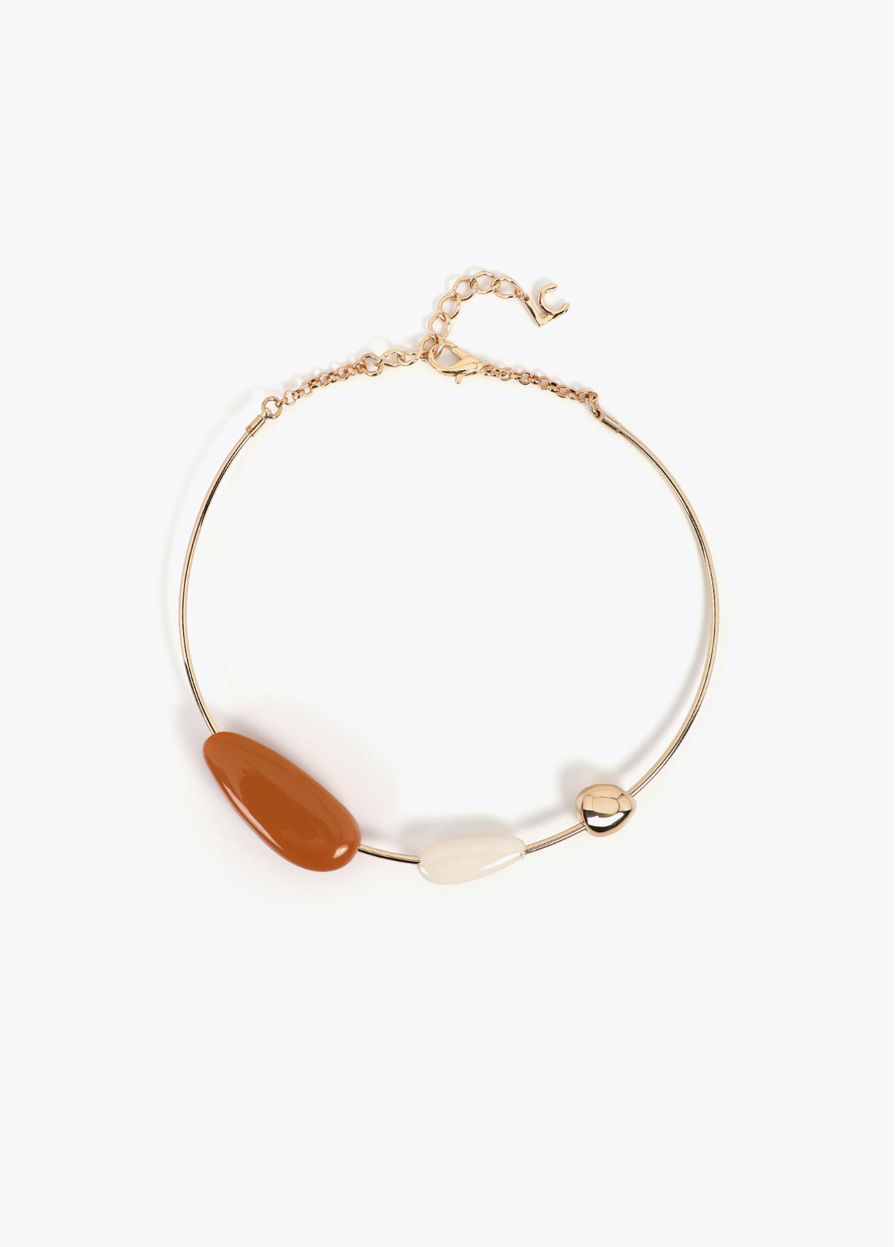 Elegante collar choker de resina bicolor con diseño moderno. Combinación de piezas en color ámbar y blanco, con un acabado dorado brillante. Sistema de cierre ajustable para personalizar el ajuste. Perfecto para agregar un toque de sofisticación a cualquier atuendo diario o de noche.