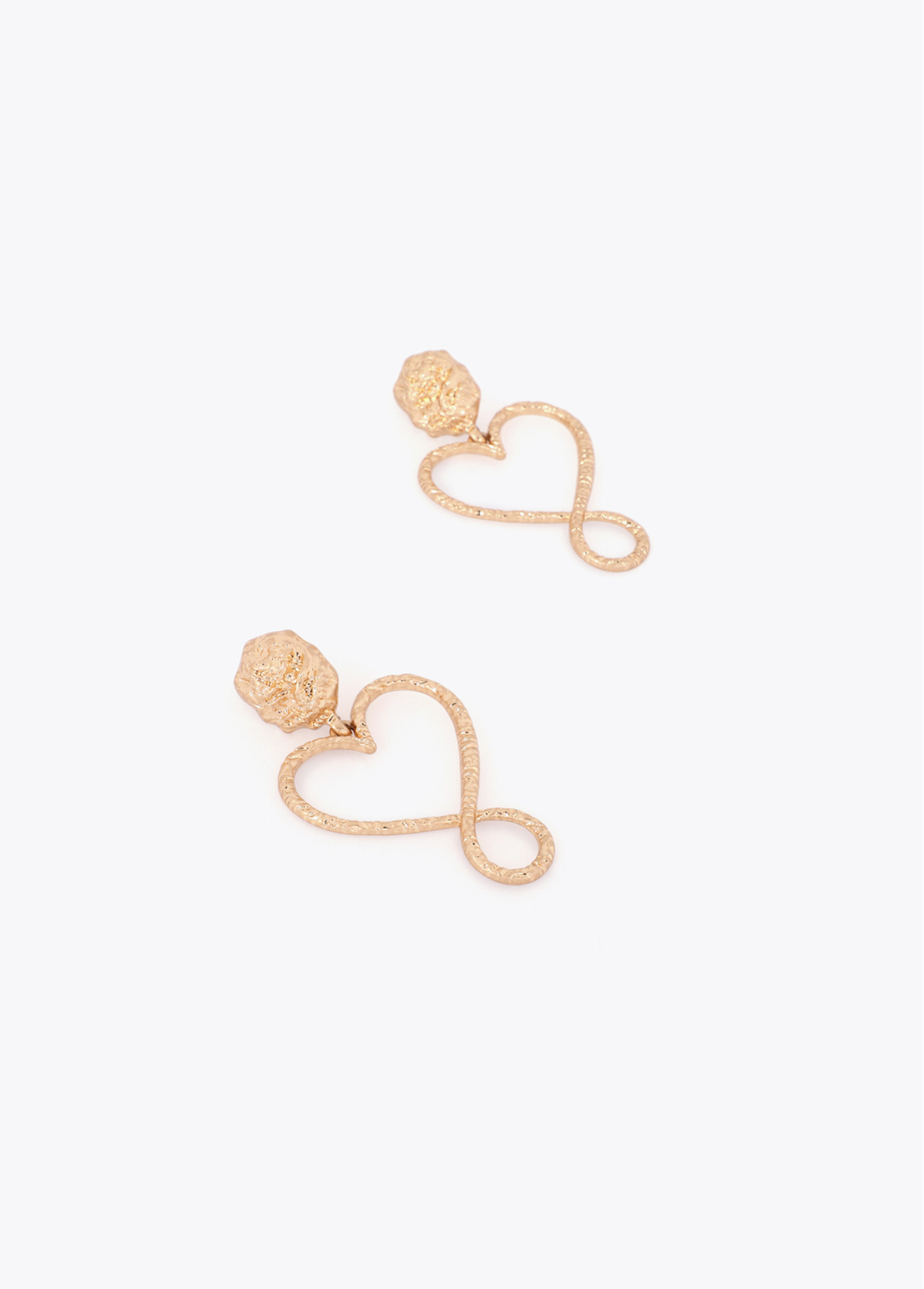 Pendientes dorados en forma de corazón con diseño infinito y textura martillada. Material metálico de gran calidad con cierre de tuerca y logo grabado. Añade un toque de sofisticación a tu look diario o eventos especiales.