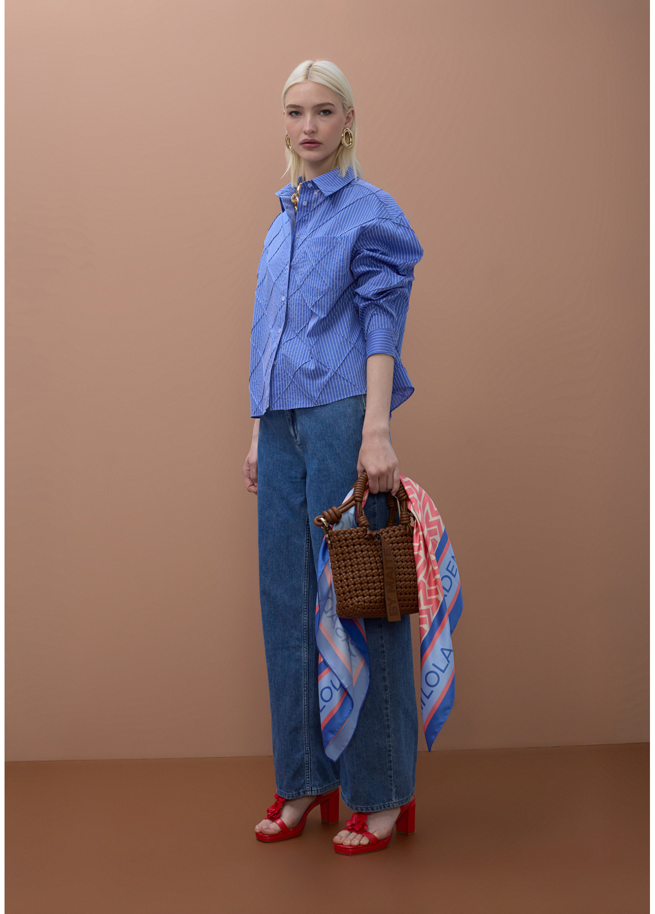 Camisa oversize confeccionada en popelín con un elegante diseño de textura de rombos. Su silueta amplia ofrece comodidad y estilo, perfecta para un look casual sofisticado. Cierre frontal de botones y cuello clásico.