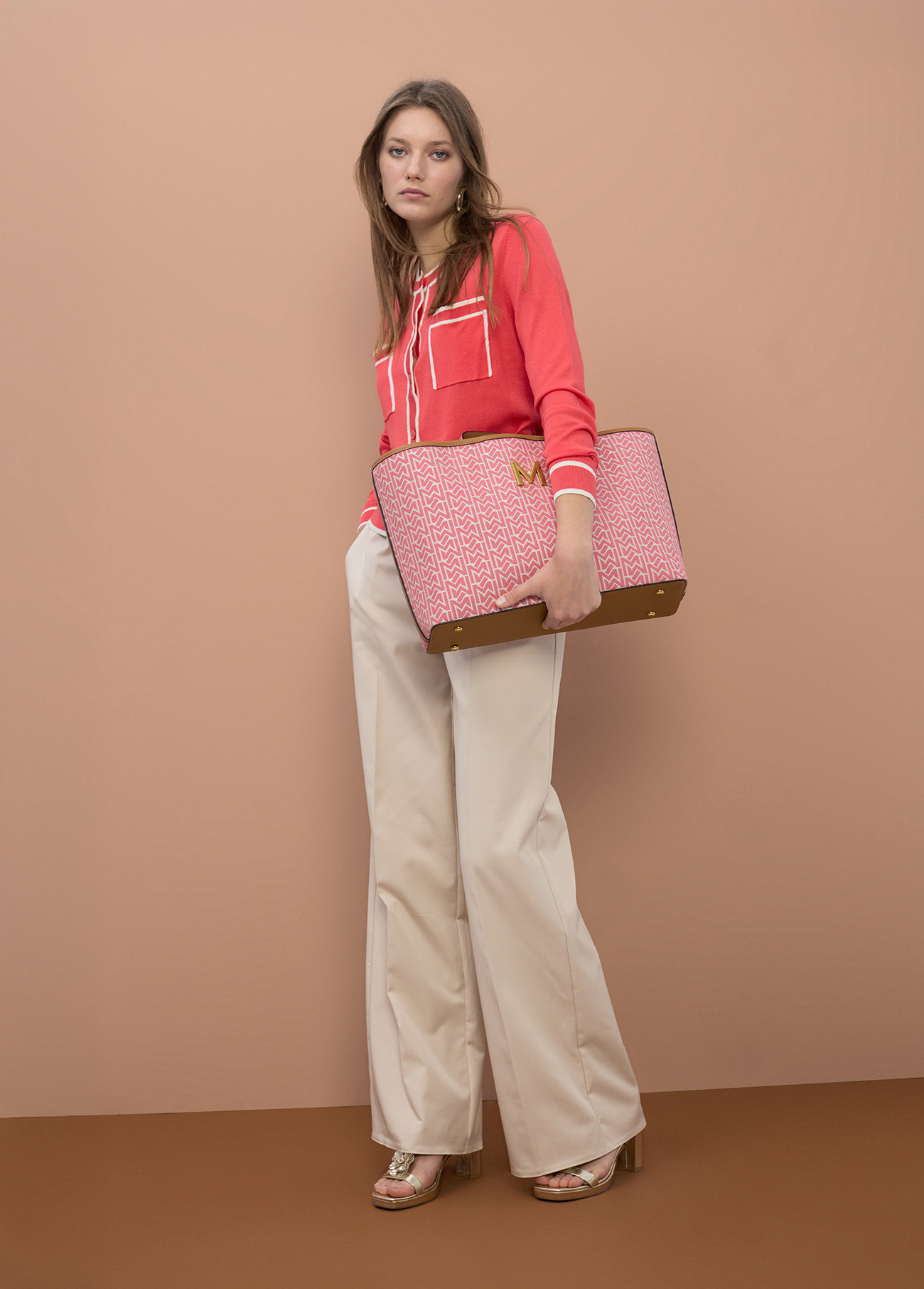 Amplio shopper con estampado jaquard y acabados en efecto piel. Diseño elegante con asas dobles y cierre magnético. Interior espacioso con forro en contraste, ideal para el día a día o para un viaje de fin de semana. Logotipo metálico en el exterior.