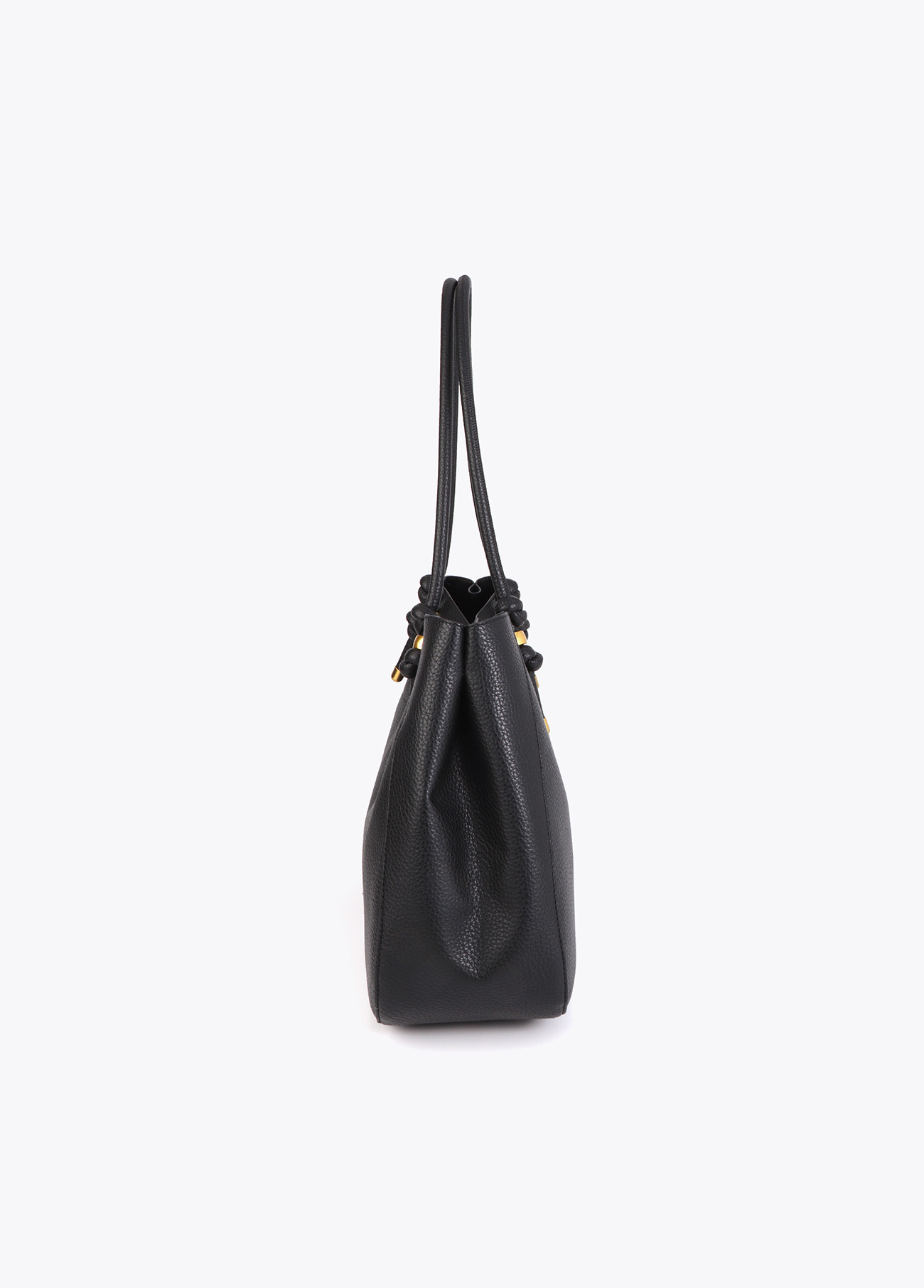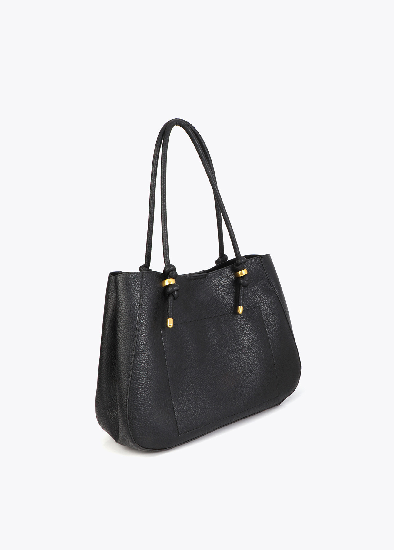 Elegante shopper de piel negra con detalles metálicos dorados. Cuenta con asas largas y un interior espacioso con bolsillos organizadores. Diseño sofisticado y funcional, ideal para el uso diario.