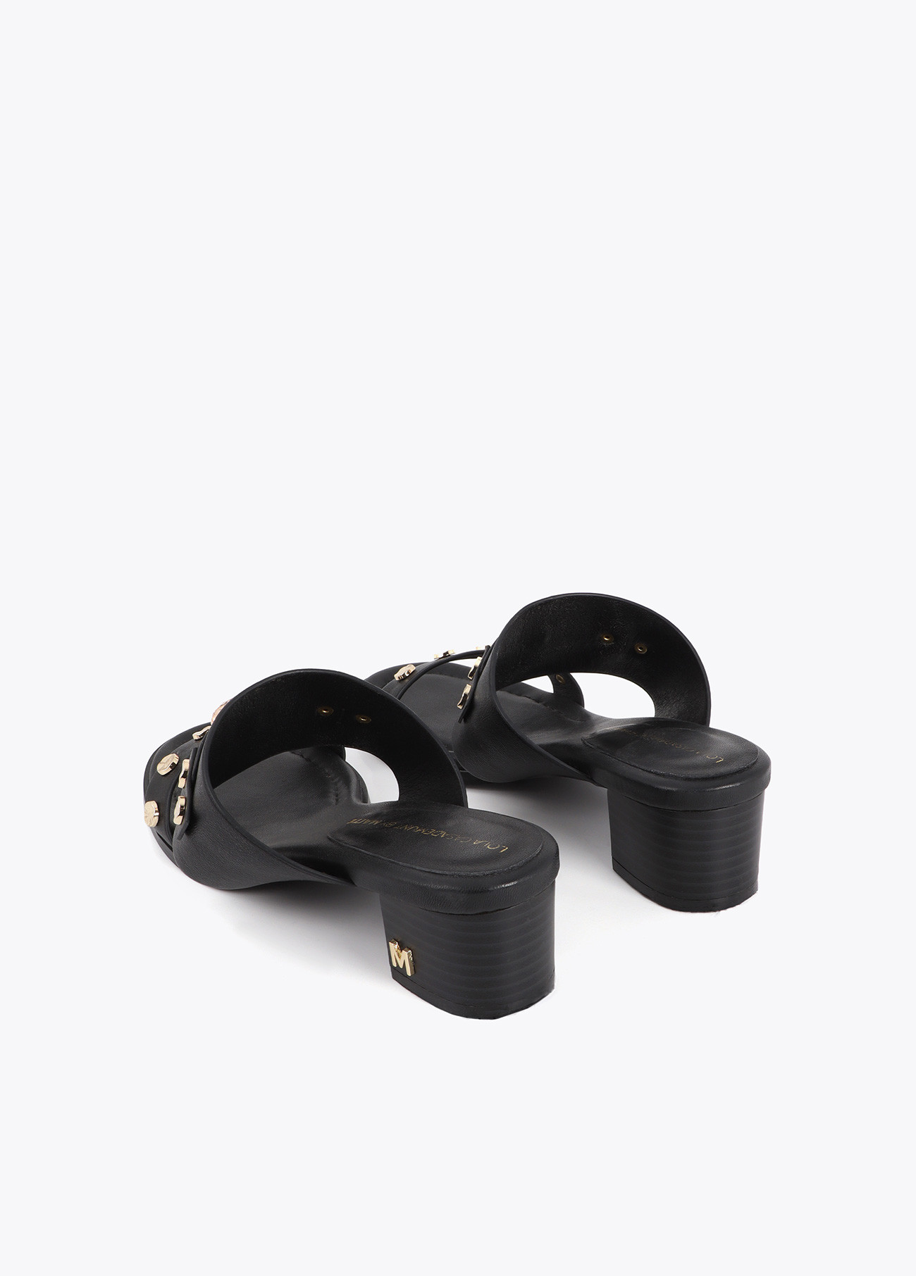 Sandalia de tacón con aplicación de cabeza de leopardo y detalles de tachas doradas. Confeccionada en cuero sintético con forro interior suave. Diseño sofisticado y elegante, ideal para un toque distintivo. Tacón cómodo de 5 cm para uso prolongado.