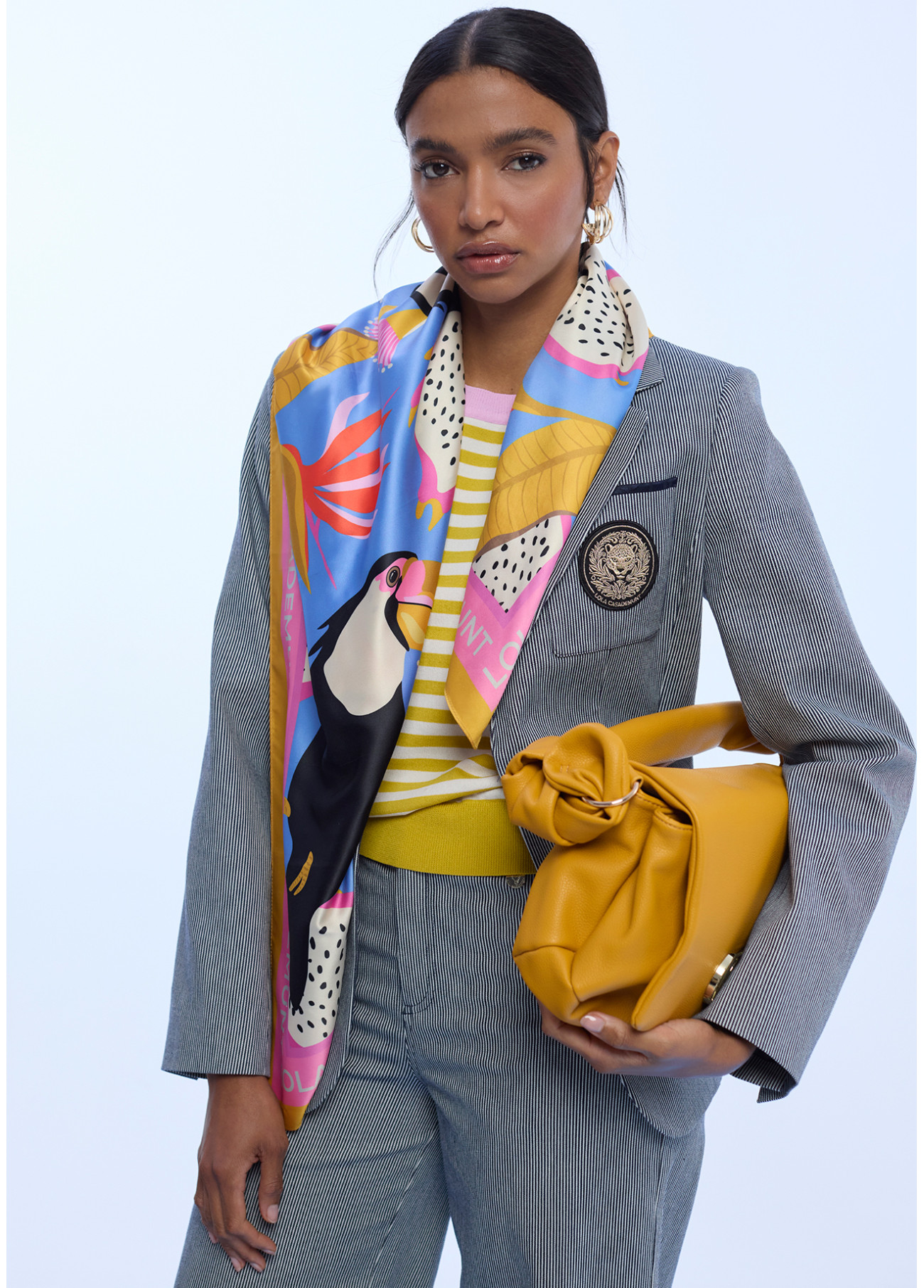 Pañuelo elegante en seda satinada con vibrante estampado tropical. Ideal para añadir un toque de color a cualquier atuendo. Suavidad y brillo excepcionales al tacto.