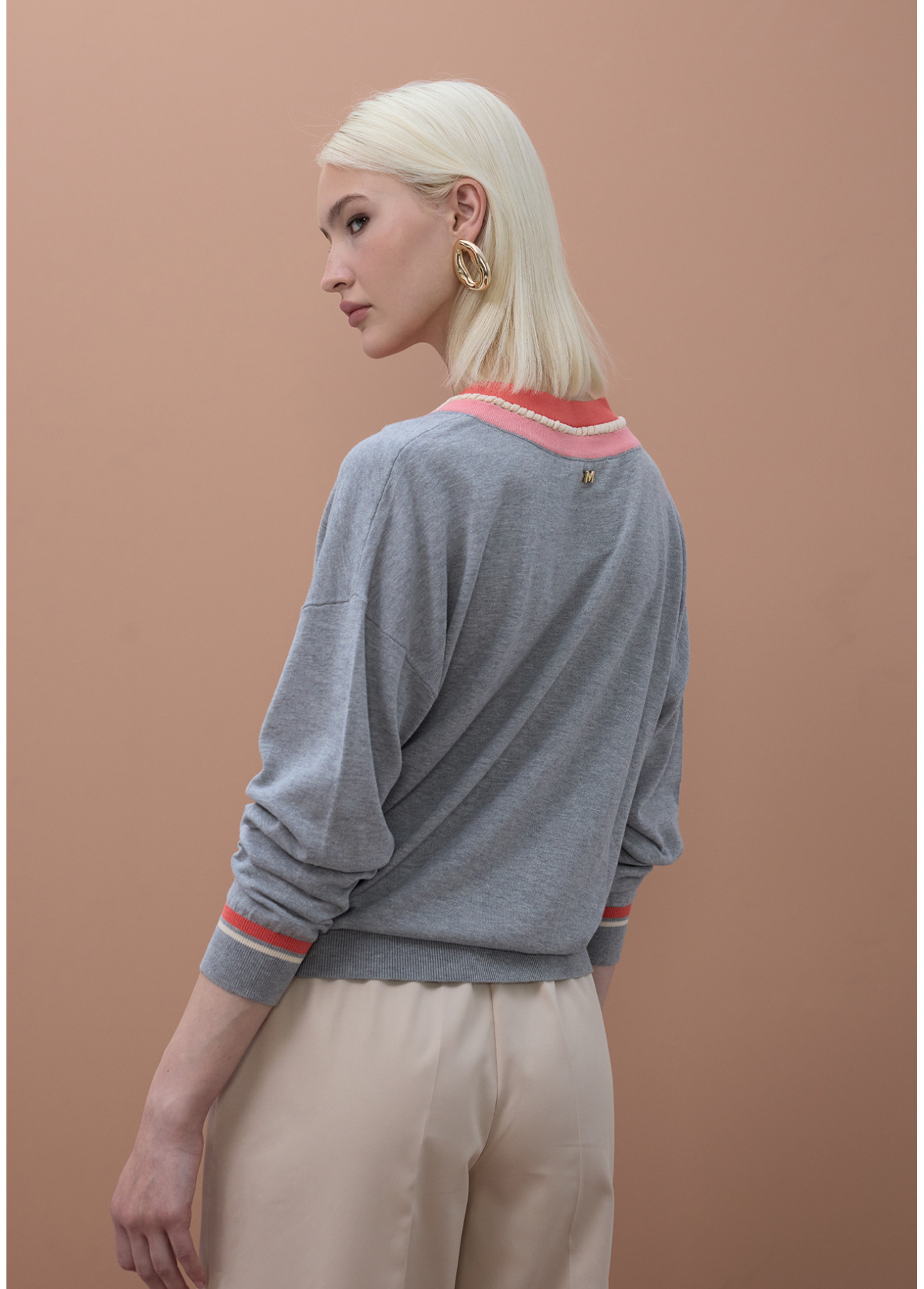 Jersey de elegante diseño con cuello pico a contraste y detalle de trenza. Confeccionado en tejido suave y ligero. Mangas largas con puños a juego. Perfecto para añadir un toque chic a cualquier conjunto casual.