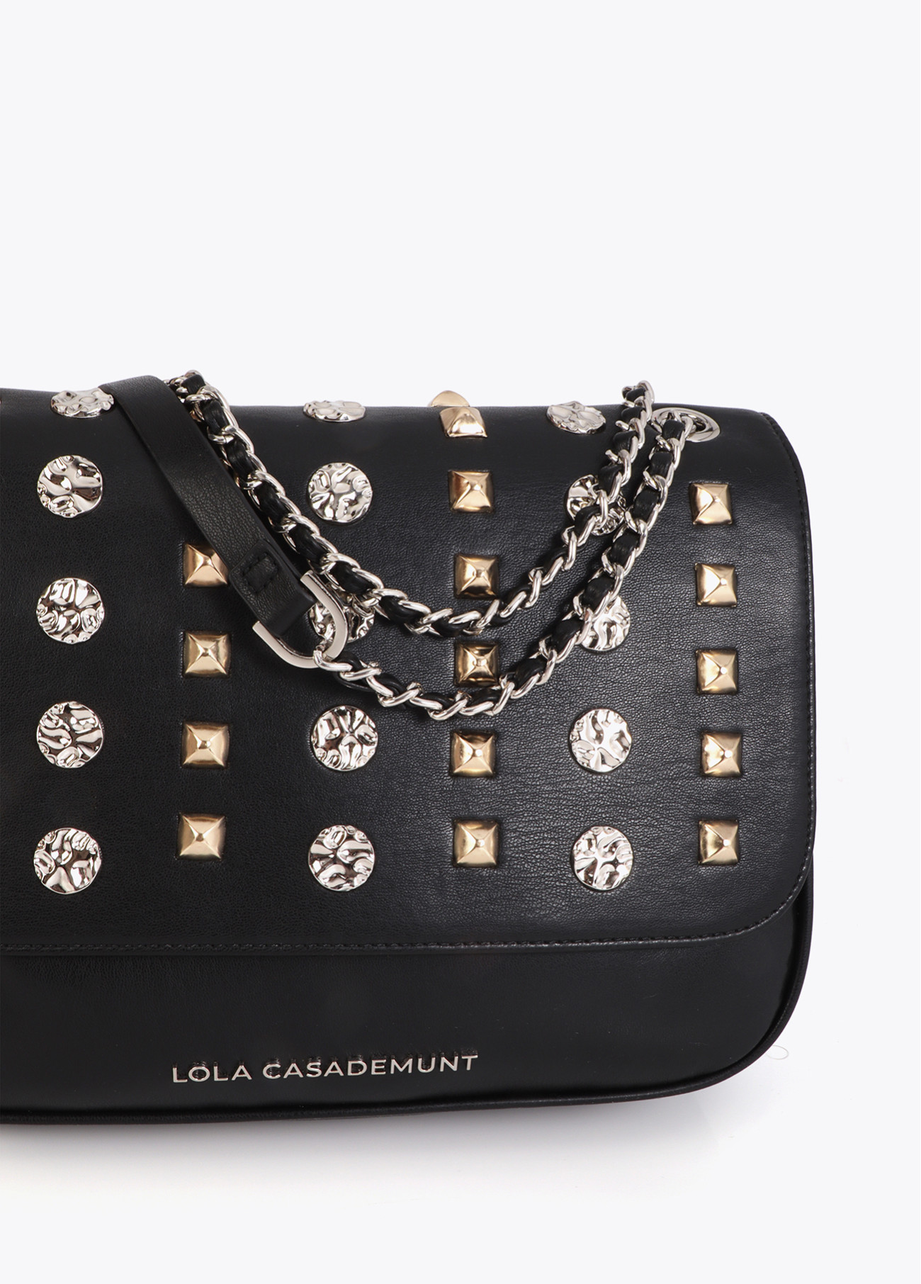 Bandolera elegante con solapa decorada con tachas doradas y brillantes. Cierre magnético seguro y cadena ajustable para mayor comodidad. Ideal para añadir un toque chic a cualquier look urbano o casual. Acabados y materiales de alta calidad.