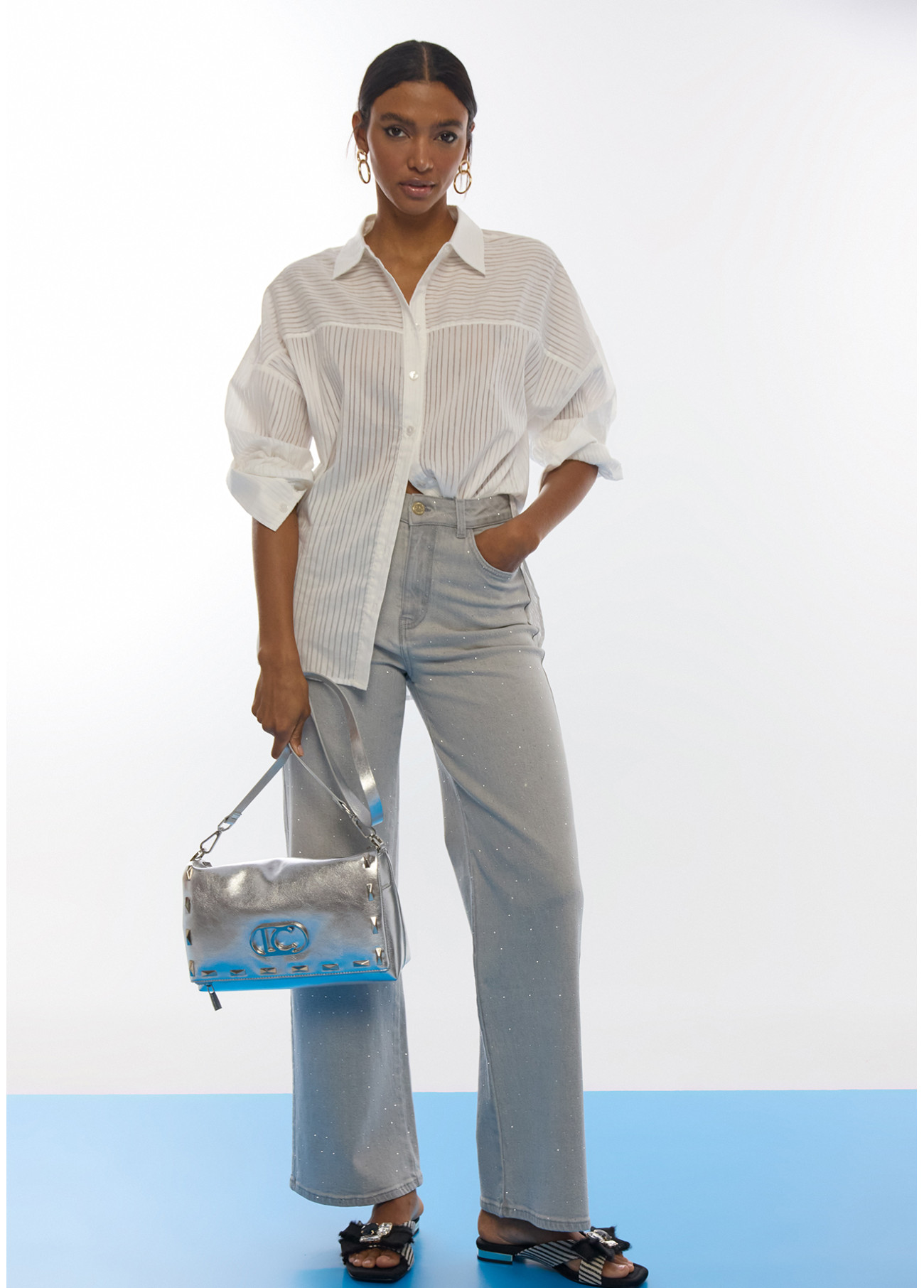 Bandolera metalizada en tono plateado con tachas rectangulares que aportan un toque moderno. Cierre con solapa, forro interior y correa ajustable para mayor comodidad. Ideal para complementar looks casuales o de noche.
