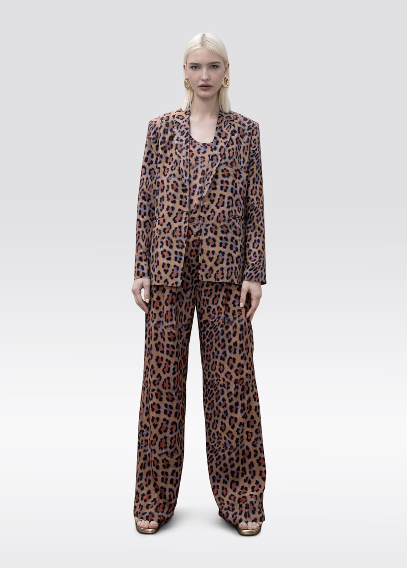 Americana recta con estampado animal en tejido fluido premium. Cuello solapa y cierre frontal con botones. Ideal para destacar en ocasiones especiales con estilo y sofisticación.