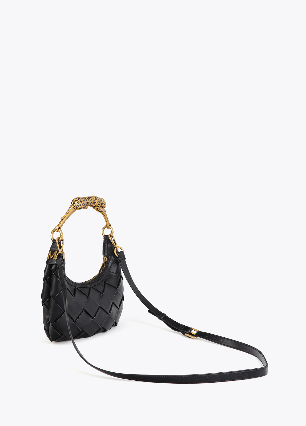 Bolso trenzado en piel sintética, diseño media luna con asa metálica en forma de leopardo. Elegante y versátil, ideal para completar cualquier look. Incluye correa ajustable para un estilo cruzado o de mano. Cierre superior seguro con cremallera.