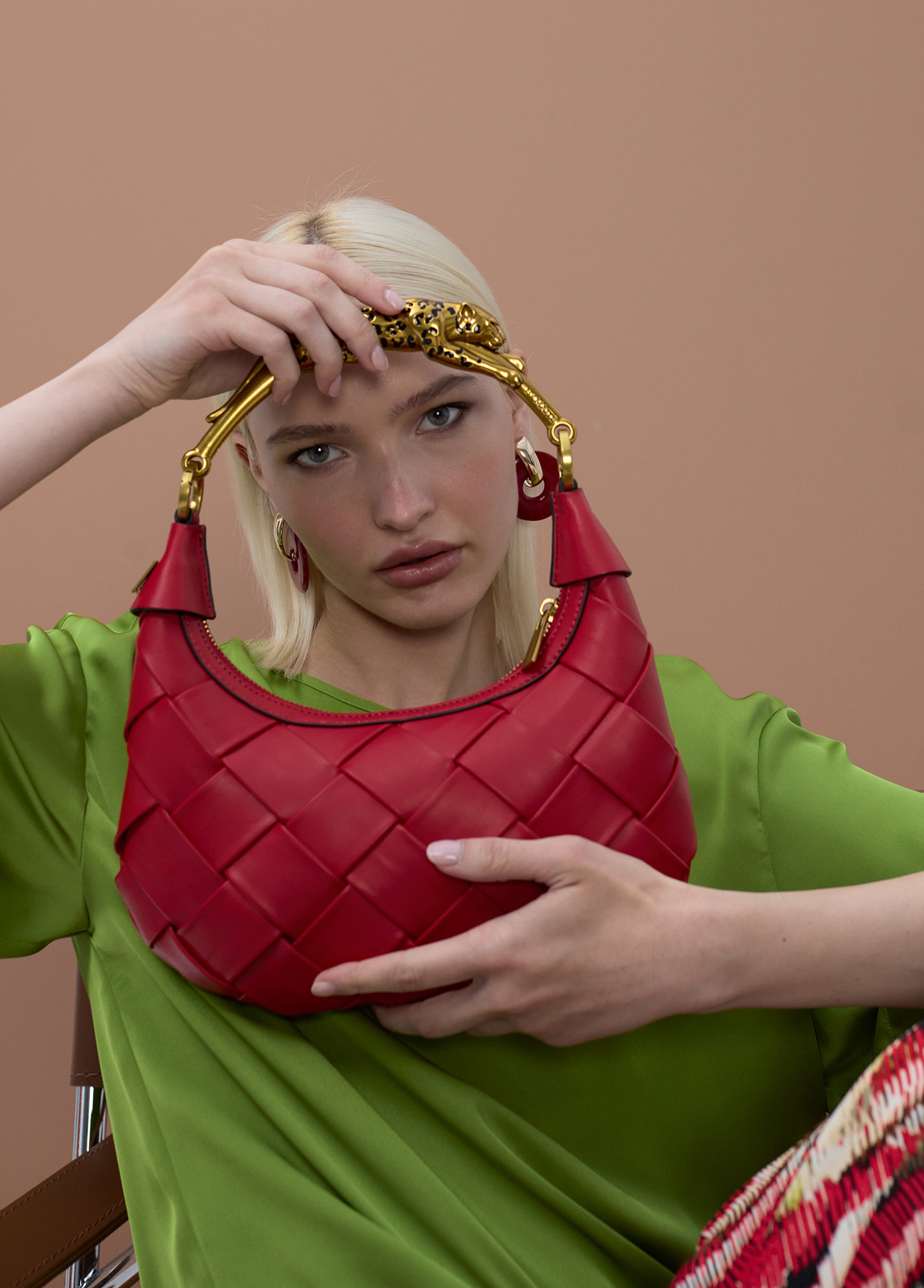Bolso media luna con diseño trenzado en elegante color rojo. Asa metálica adornada con figura de leopardo, aportando un toque exótico. Cierre de cremallera y correa ajustable para mayor comodidad.