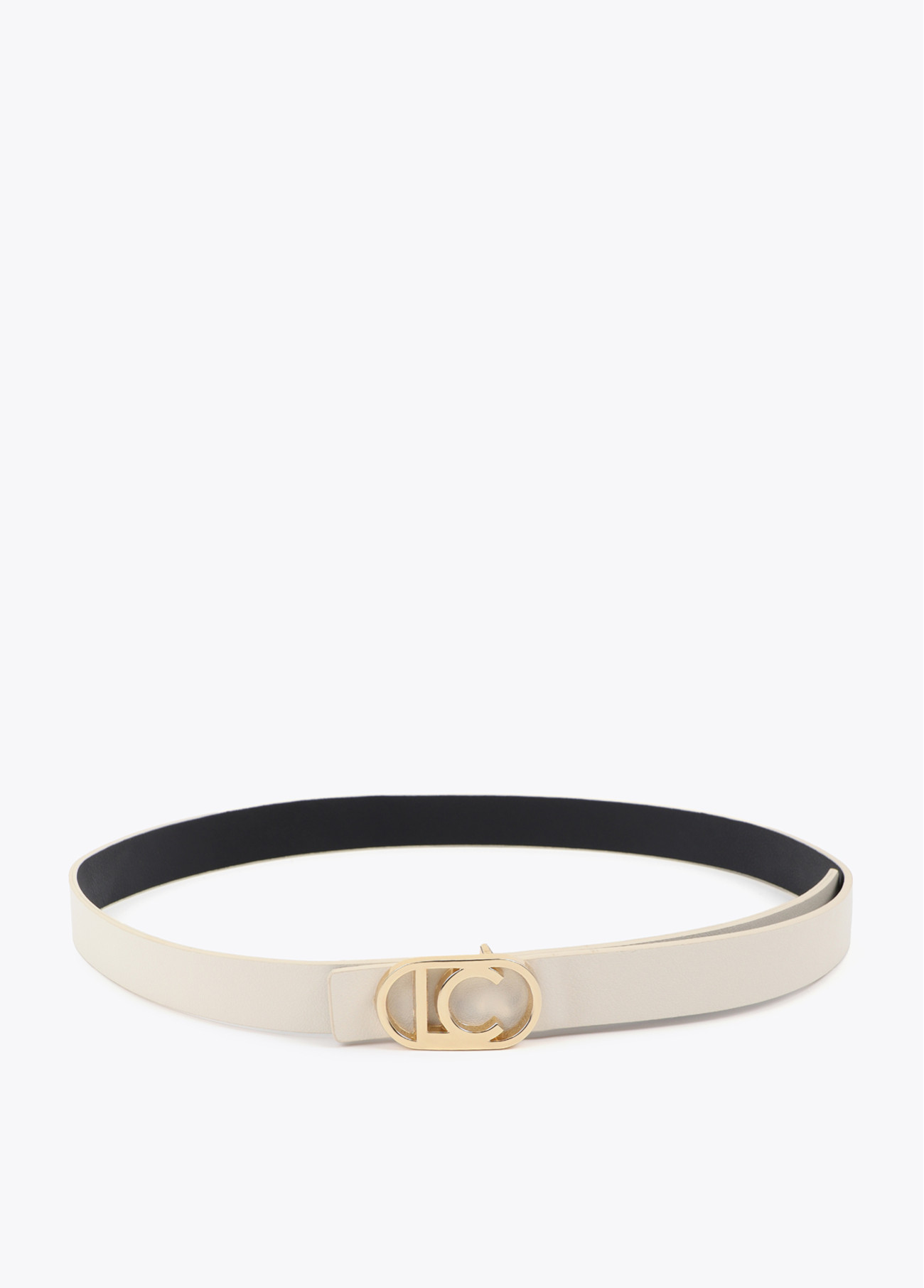 Cinturón reversible de diseño elegante con hebilla en forma de logo ovalado dorado. Fabricado en material sintético de alta calidad, permite dos combinaciones de color: negro y blanco. Un complemento versátil y chic para cualquier atuendo.