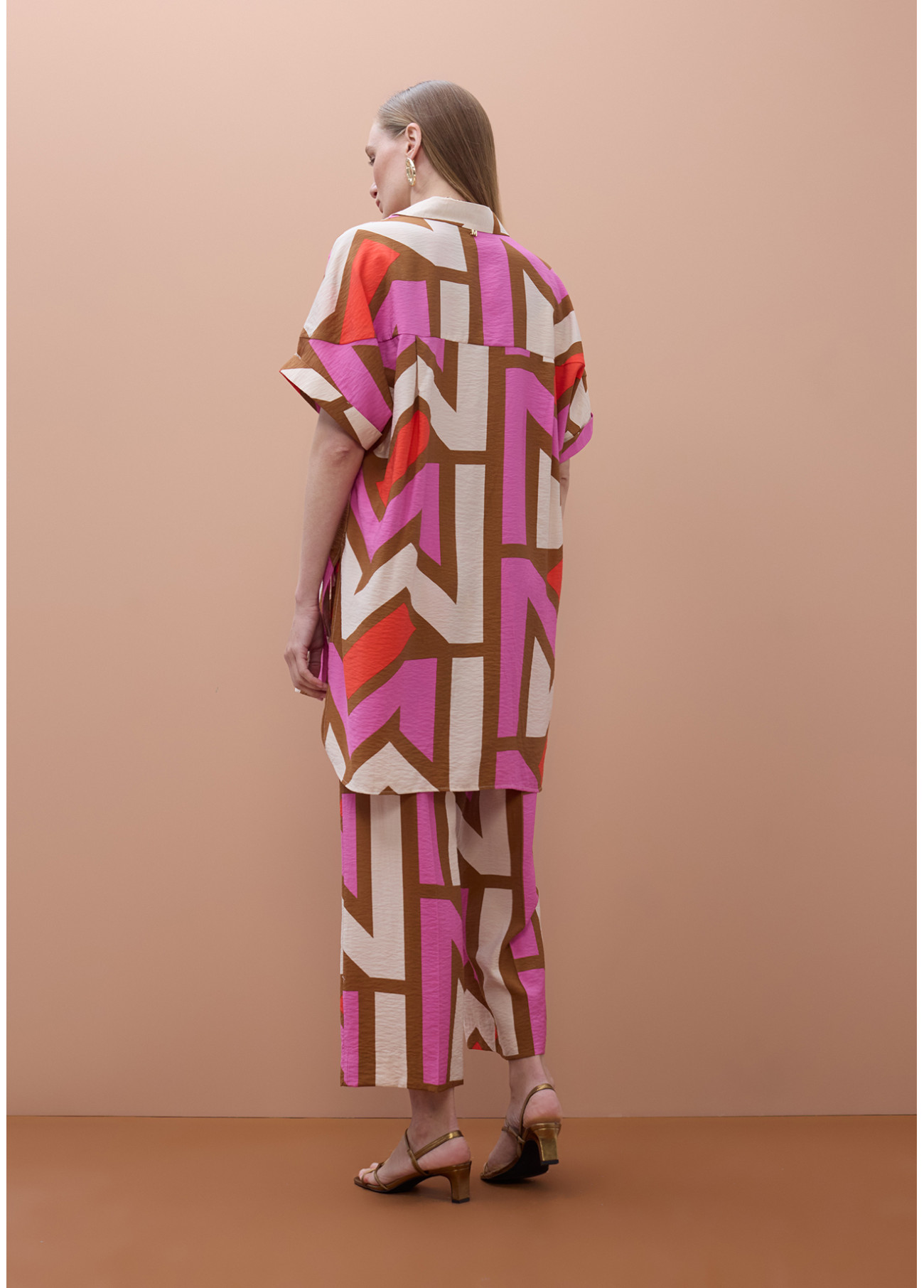 Este pantalón culotte presenta un diseño fluido con un estampado geométrico audaz en tonos vivos. Confeccionado en tejido ligero para garantizar comodidad y estilo. Cintura elástica y corte amplio que favorece cualquier figura, ideal para un look casual.