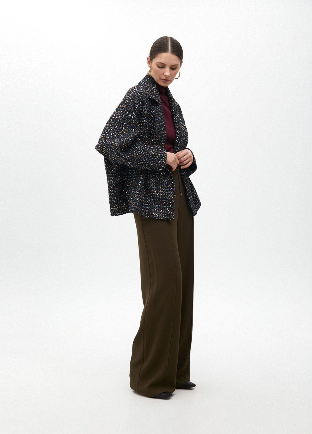 Chaqueta de tweed con hilos multicolor en corte clásico. Presenta un diseño oversize de doble botonadura. Tejido de calidad superior para un estilo atemporal. Ideal para combinar con cualquier look de día.