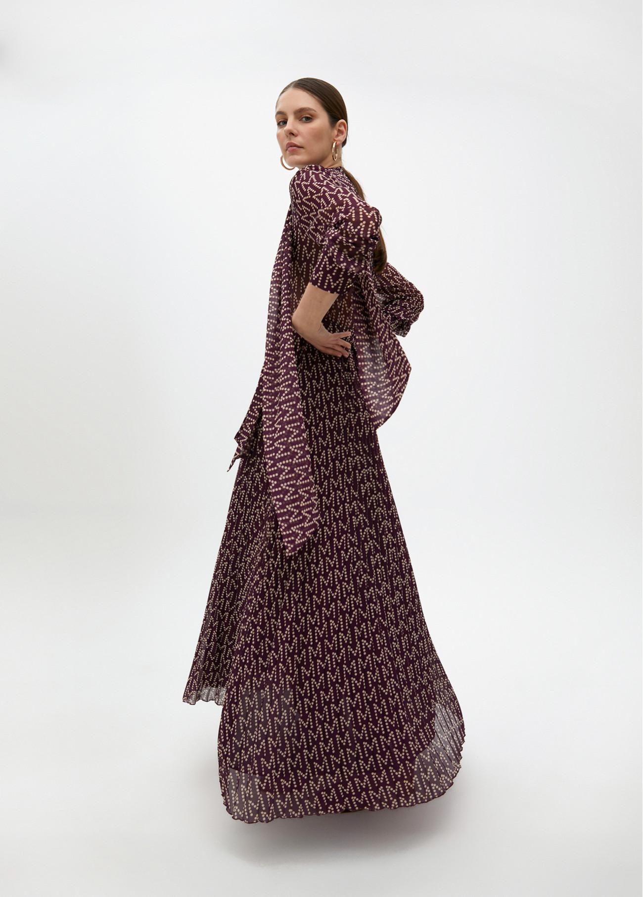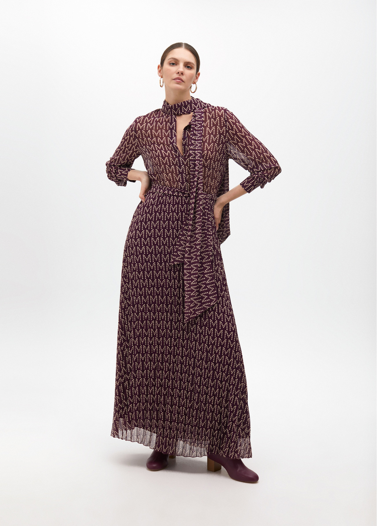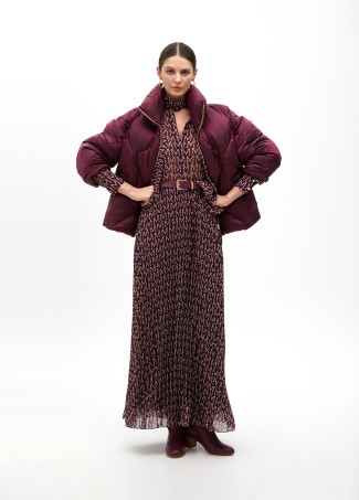 Vestido largo plisado con logotipo integral en tejido ligero. Diseño con cuello alto y lazo, mangas largas y cierre de cremallera en la parte trasera. Elegancia y estilo en cada detalle, perfecto para ocasiones especiales.