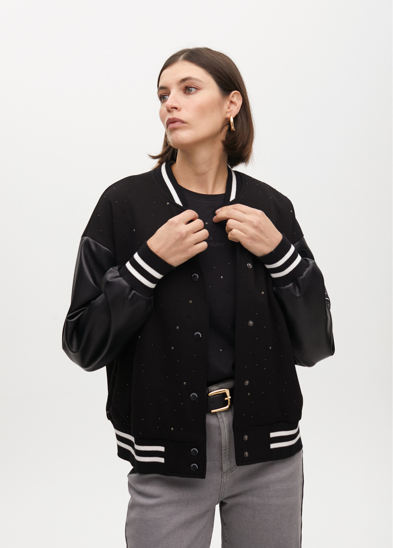 Chaqueta bomber con detalle de pedrería y mangas en efecto piel. Presenta ribetes acanalados y cierre frontal con botones a presión. Disponible en color negro con detalle logo en la manga.
