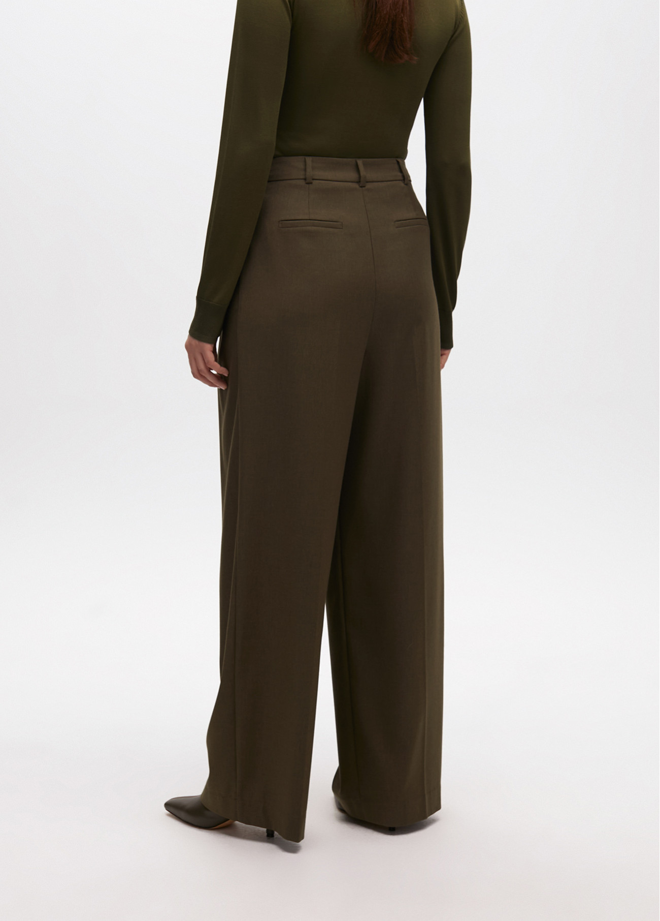 Pantalón palazzo de corte amplio con elegantes pinzas frontales. Confeccionado en poliéster de alta calidad. Cintura alta con trabillas para cinturón. Dos bolsillos laterales y cierre con cremallera oculta.