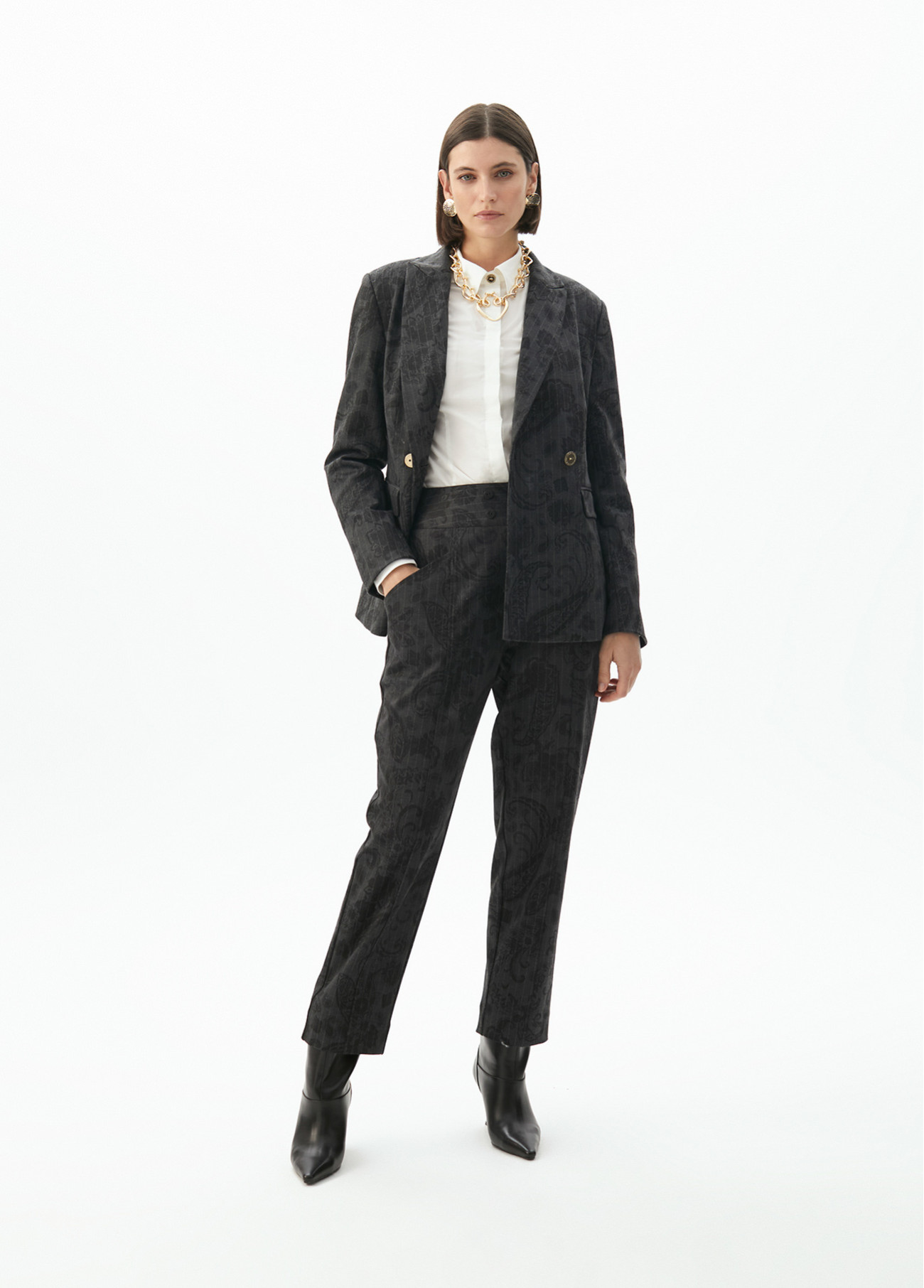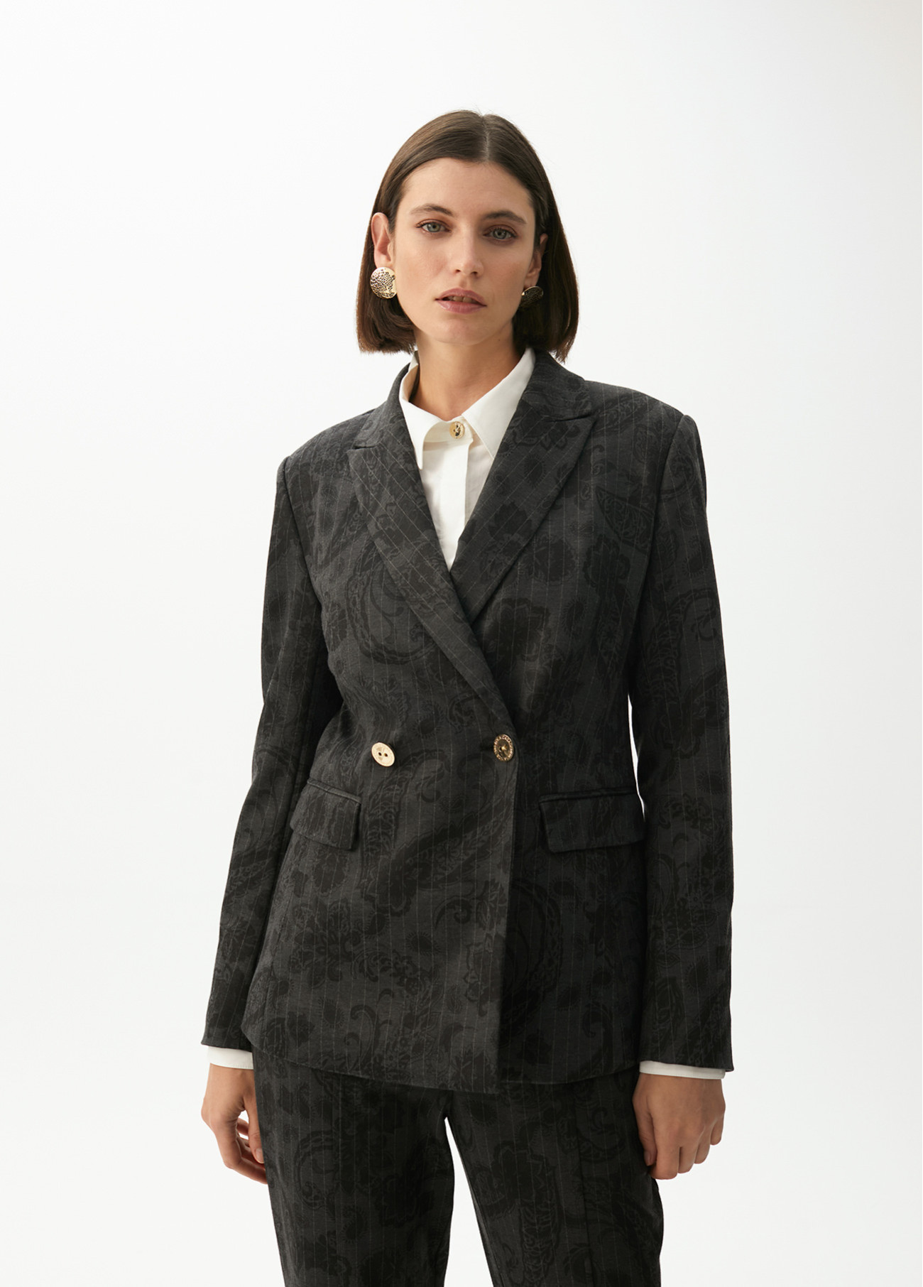 Elegante americana con diseño jacquard y detalles de botones dorados. Confeccionada en tejido premium, ofrece un ajuste entallado con solapa de muesca y cierre cruzado. Ideal para un look sofisticado.