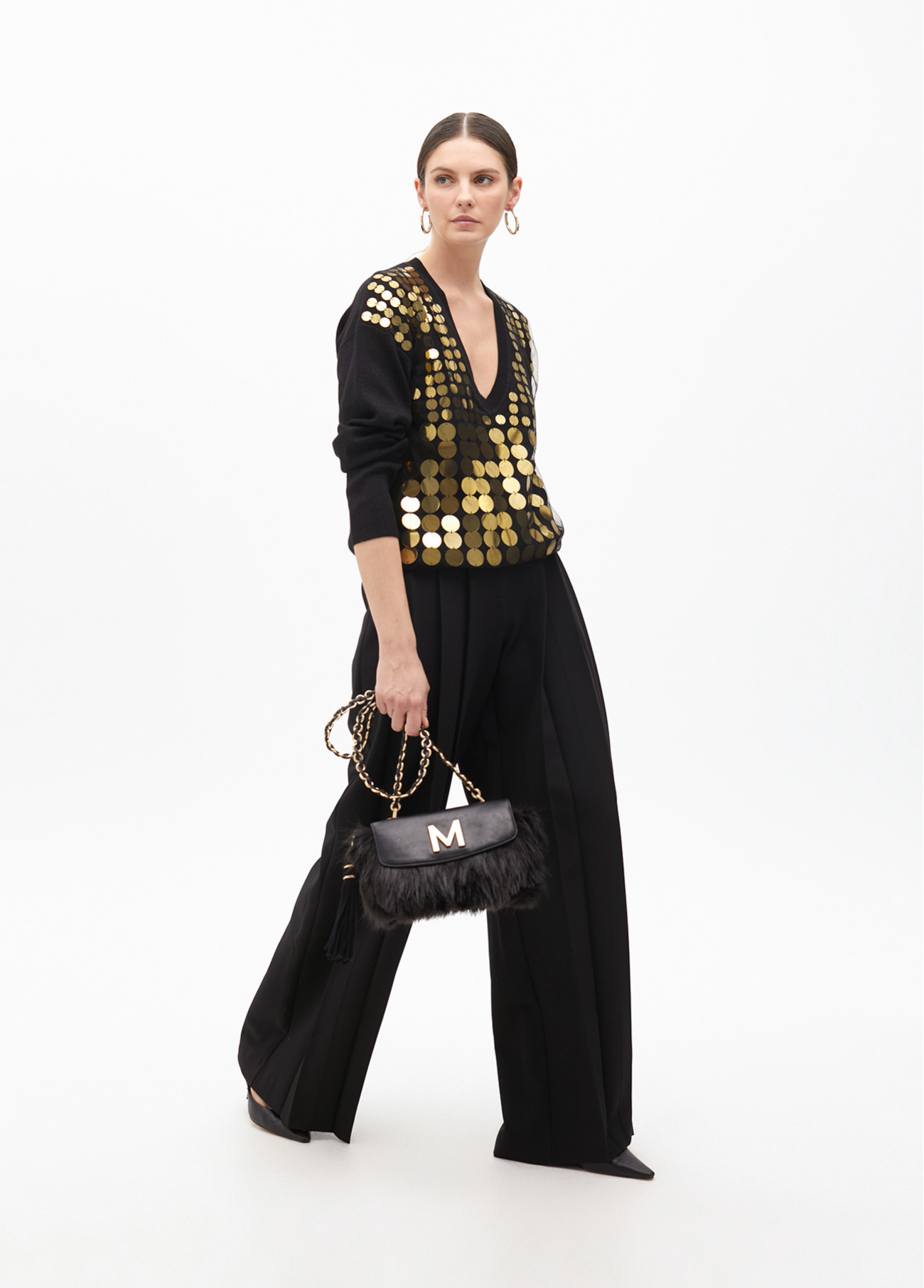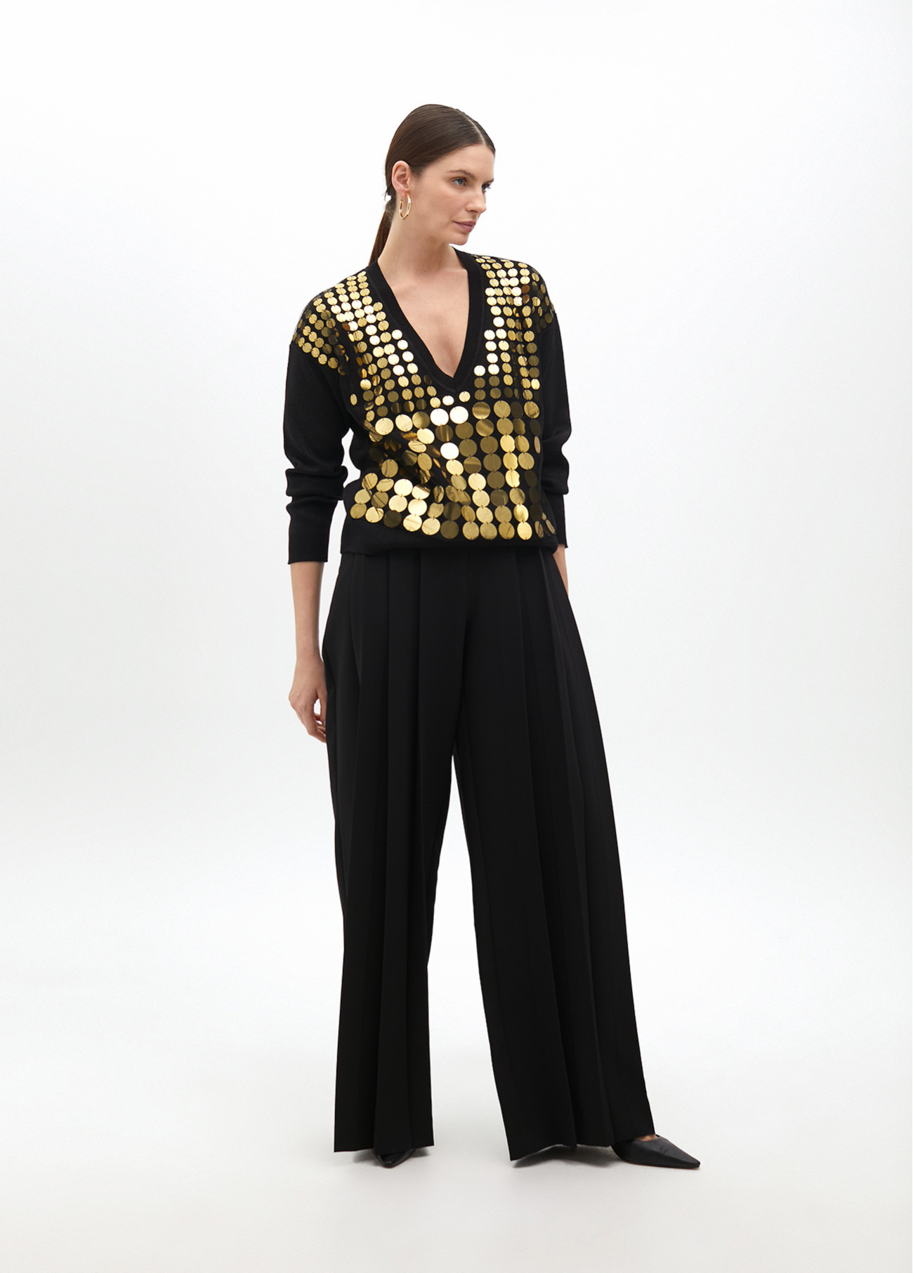 Jersey de malla adornado con lentejuelas doradas, diseño de cuello en V y mangas largas. Combina un estilo sofisticado con un toque de glamour, ideal para destacar.