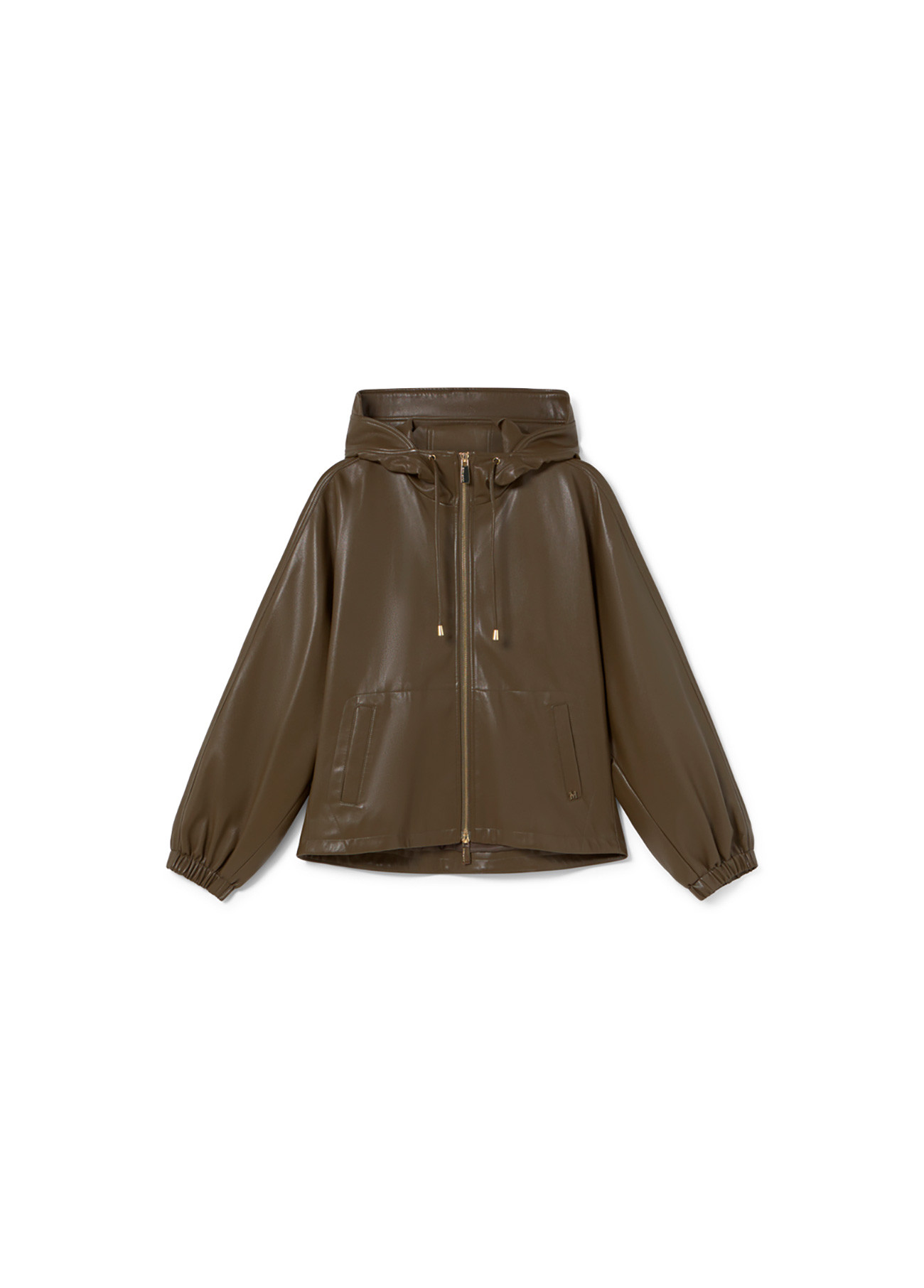 Bomber oversize con efecto piel y cierre de cremallera. Diseño de mangas murciélago y capucha ajustable. Acabado en puños elásticos y bolsillos delanteros. Ideal para un look moderno y sofisticado.