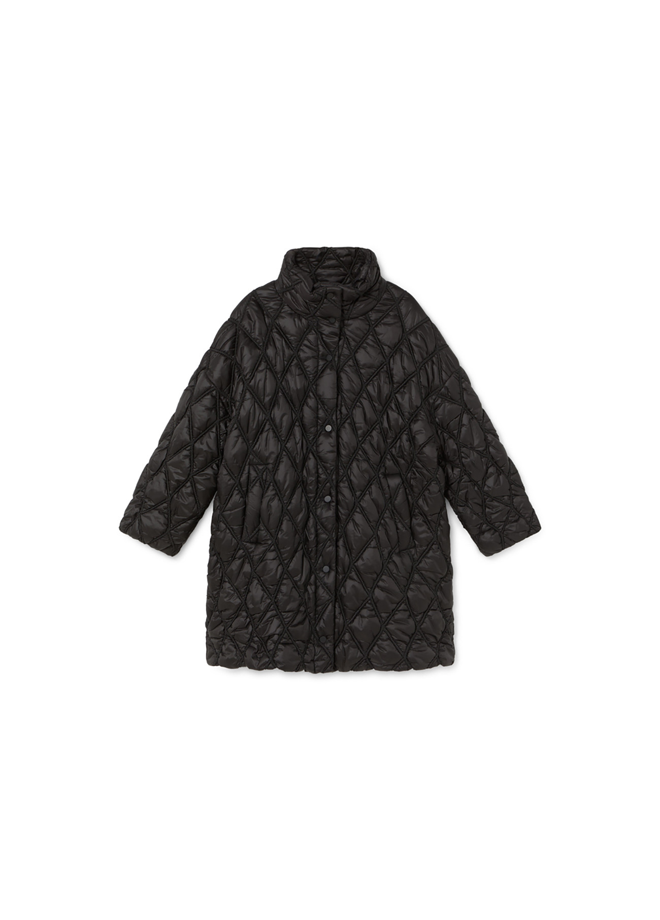 Abrigo largo 3/4 acolchado en tejido ligero con acabado brillante. Cierre frontal de botones y cuello alto para mayor calidez. Diseño con bolsillos laterales y estilo relajado, ideal para cualquier ocasión durante los meses fríos.