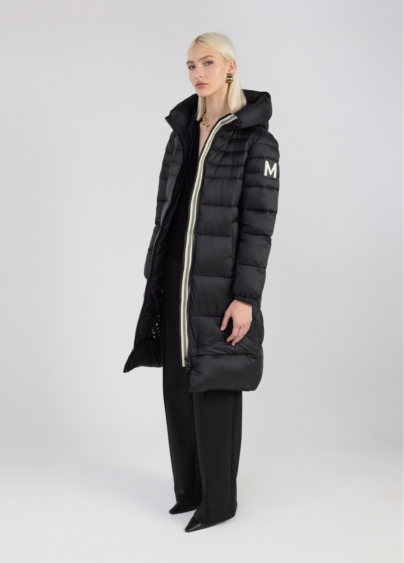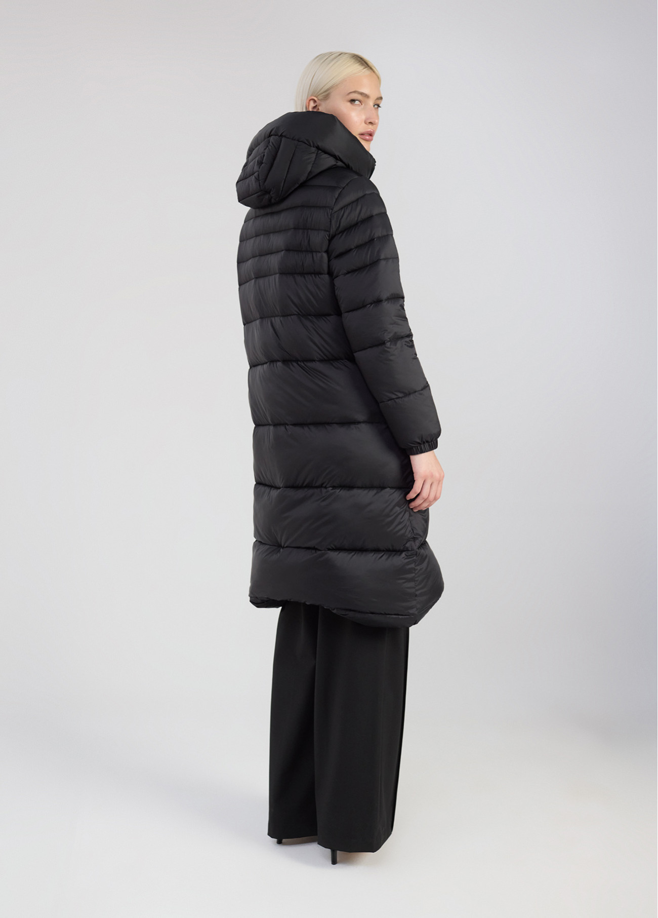 Este anorak largo negro presenta un diseño acolchado con forro logotipado. Incluye capucha ajustable y cierre frontal de cremallera. Ideal para mantener el calor con estilo.