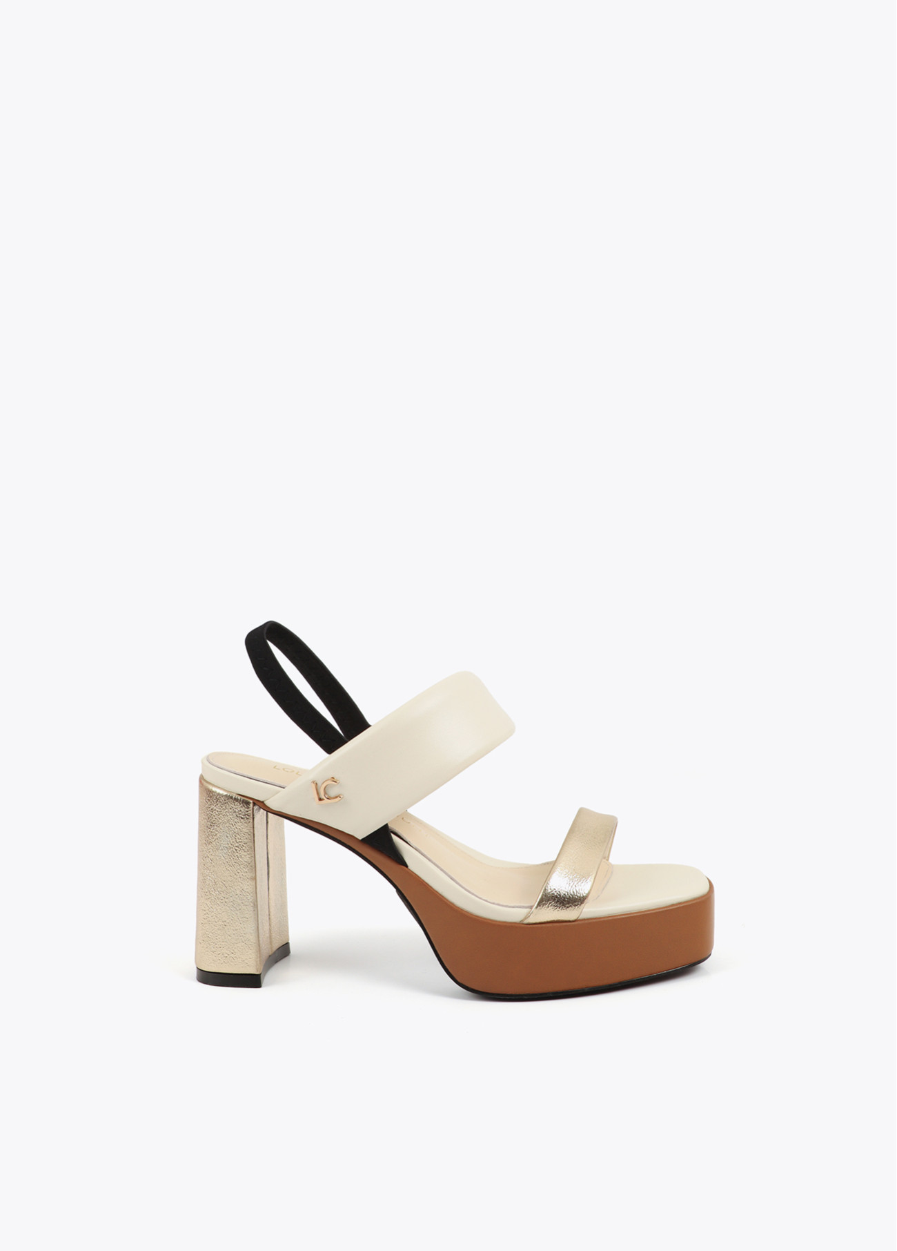 Sandalia de tacón alto con diseño de tiras tricolor en tonos crema, dorado y marrón. Elegante cierre elástico negro. Plataforma cómoda y logo distintivo LC en lateral. Ideal para resaltar en eventos o cenas especiales. Fabricada con materiales de alta