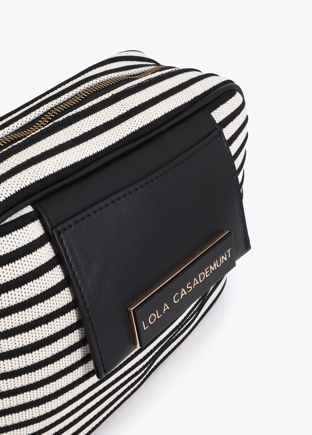 Bolso bandolera con diseño a rayas y detalles en efecto piel. Cierre con cremallera dorada y correa ajustable. Presenta una placa con el logotipo de la marca al frente, combinando estilo y funcionalidad en un accesorio ideal para el día a día.