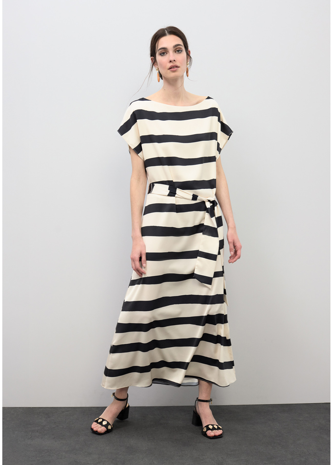 Este vestido satinado de rayas horizontales presenta un diseño elegante en tonos clásicos. Con un cinturón a juego y manga corta, es perfecto para destacar en cualquier evento. Suave al tacto y de caída fluida, proporciona comodidad durante todo el día