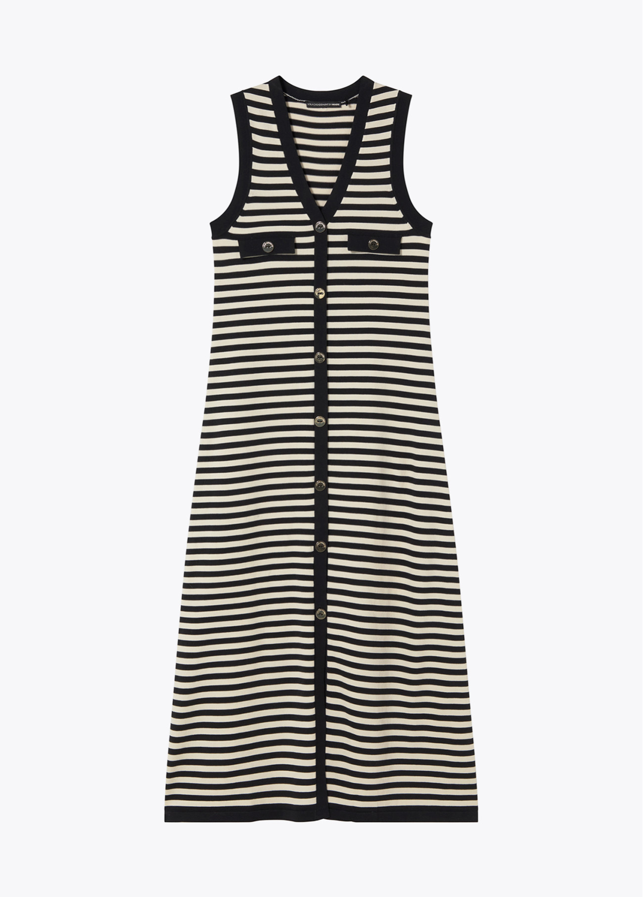 Vestido largo de tricot, sin mangas, con un moderno diseño de rayas en contraste. Presenta una elegante abertura frontal y cierre de botones dorados. Ideal para combinar con accesorios llamativos.