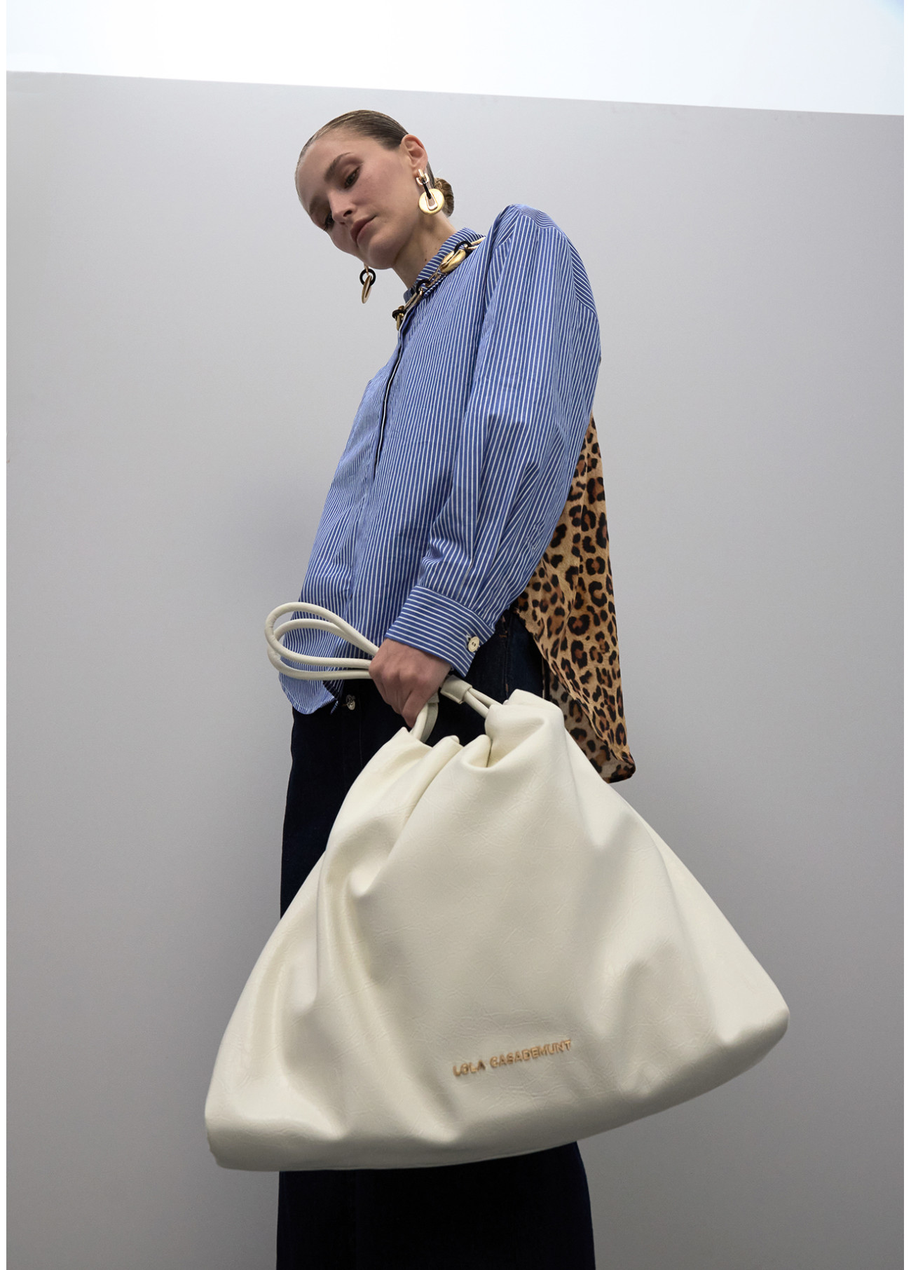 Shopper élégant en blanc avec détail de nœud et logo doré. Fabriqué en cuir synthétique de haute qualité. Inclut une fermeture magnétique et un intérieur spacieux, parfait pour un usage quotidien.