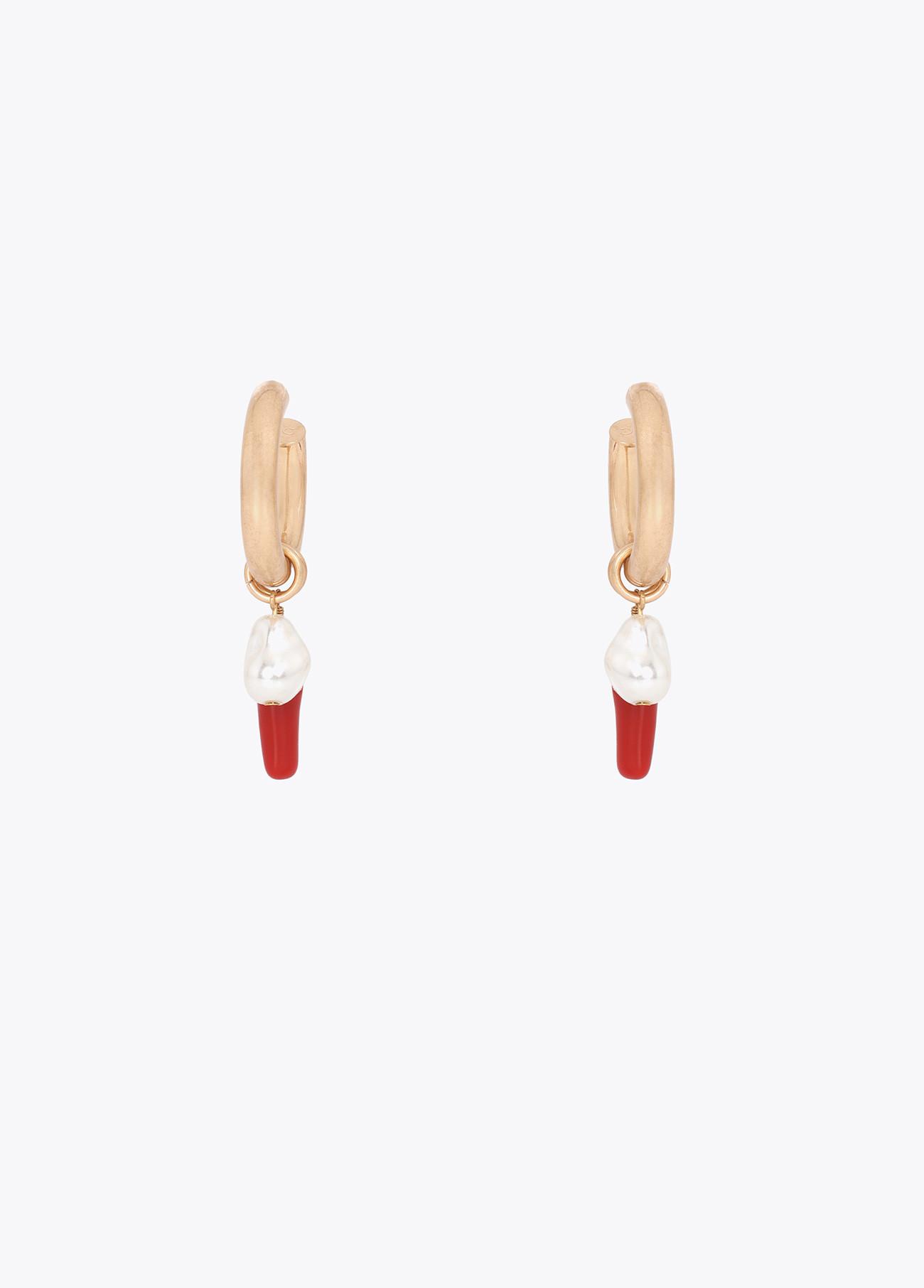 Boucles d'oreilles créoles dorées avec breloques en corail et perle. Design élégant avec fermeture à pression, parfait pour ajouter une touche sophistiquée à tout look.