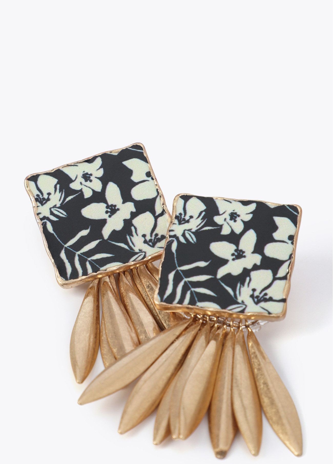 Boucles d'oreilles avec céramique peinte à la main, combinées avec du métal doré. Design floral en tons sombres et forme carrée. Fermoir à vis.