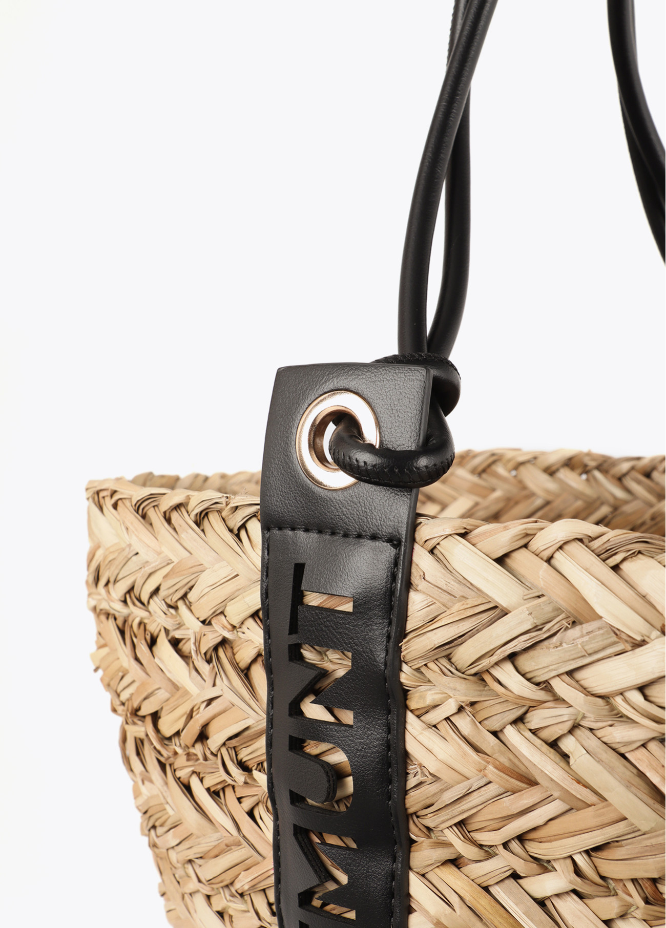 Cabas chic en osier avec poignées en cuir synthétique présentant un détail découpé pour mettre en valeur le logo de Lola Casademunt. Intérieur doublé avec imprimé animal. Parfait pour un style estival chic, idéal pour la ville ou la plage.