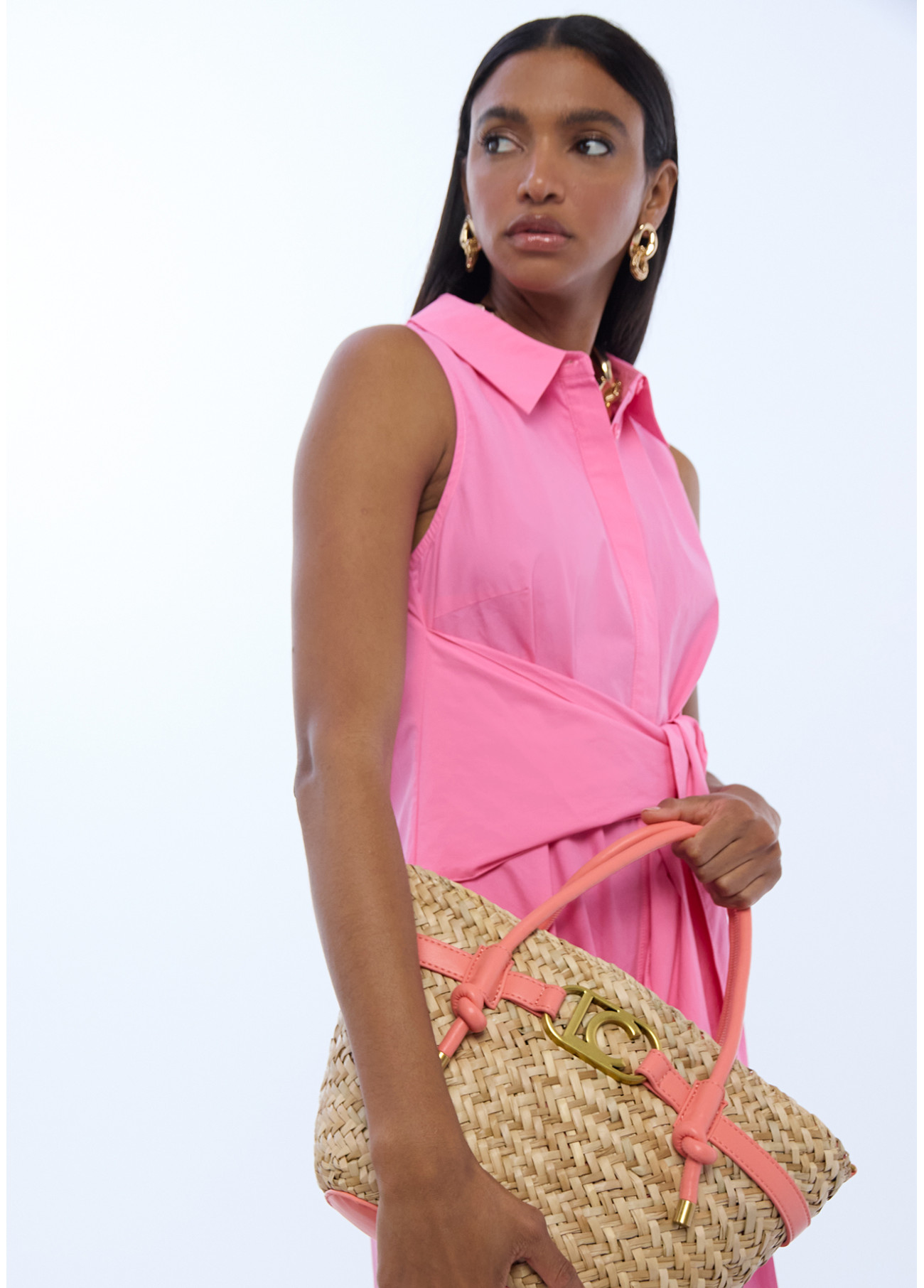 Élégant mini cabas avec poignées et détails en simili cuir. Parfait pour ajouter une touche chic à vos tenues d'été. Comprend une fermeture à cordon réglable et un logo métallisé. Idéal pour transporter vos essentiels avec style.