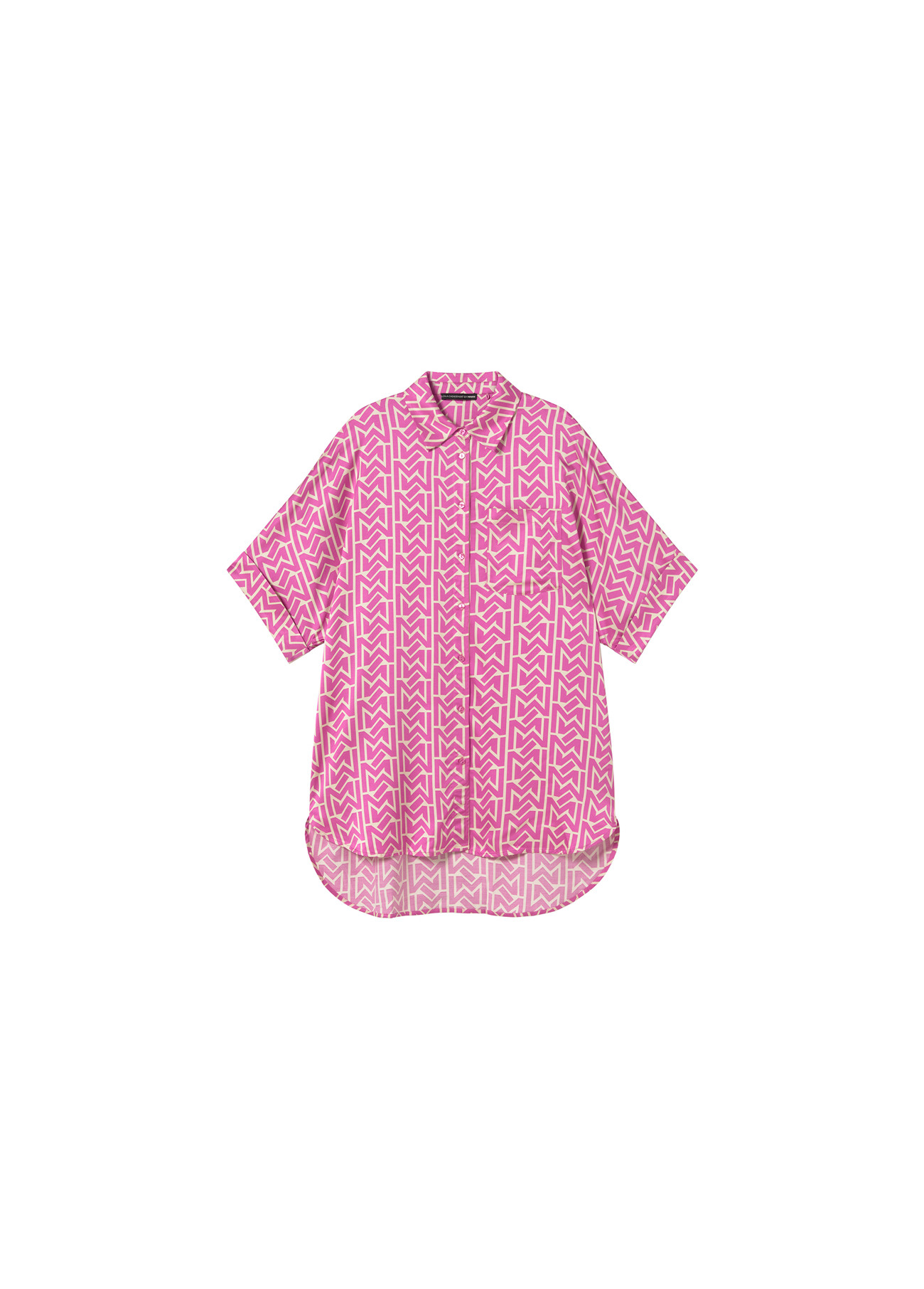 Chemise satinée à manches courtes avec imprimé géométrique en tons roses. Col classique et une poche poitrine avec un logo discret. Parfaite pour un look décontracté élégant.