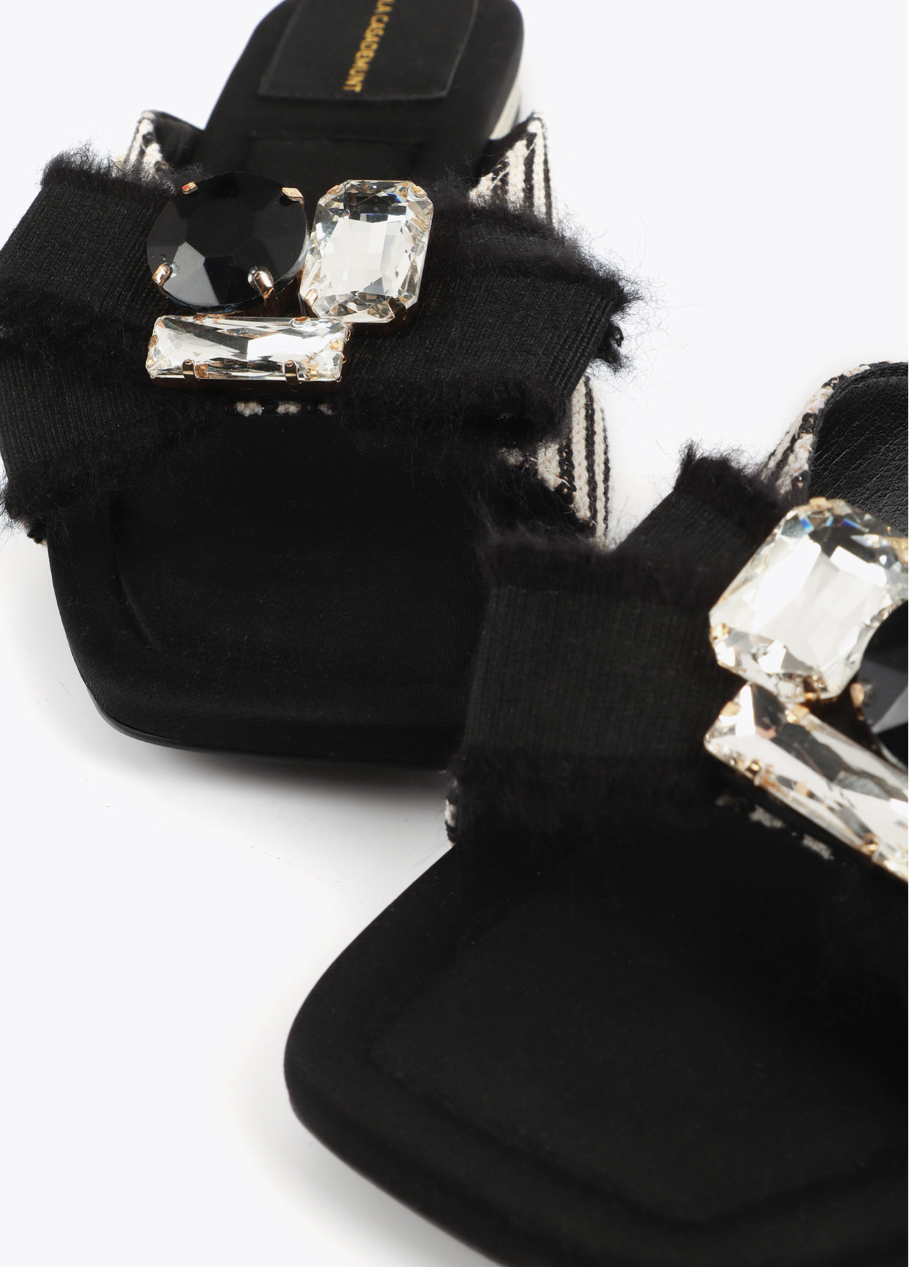 Sandale plate élégante en toile avec design rayé. Présente un nœud décoratif avec des ornements brillants. Semelle confortable pour de longues marches. Moderne et polyvalente pour toutes tenues décontractées.