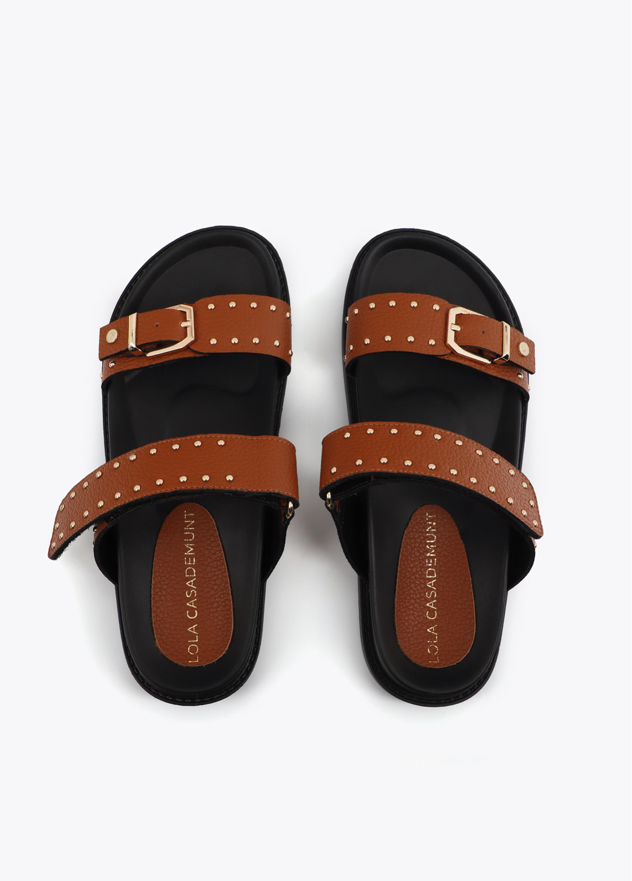 Sandale plate avec brides ornées de détails métalliques. Design confortable et polyvalent idéal pour l'été. Semelle coussinée pour plus de confort. Fermeture à boucle réglable. Parfaites pour styliser n'importe quel look décontracté avec une touche moderne.
