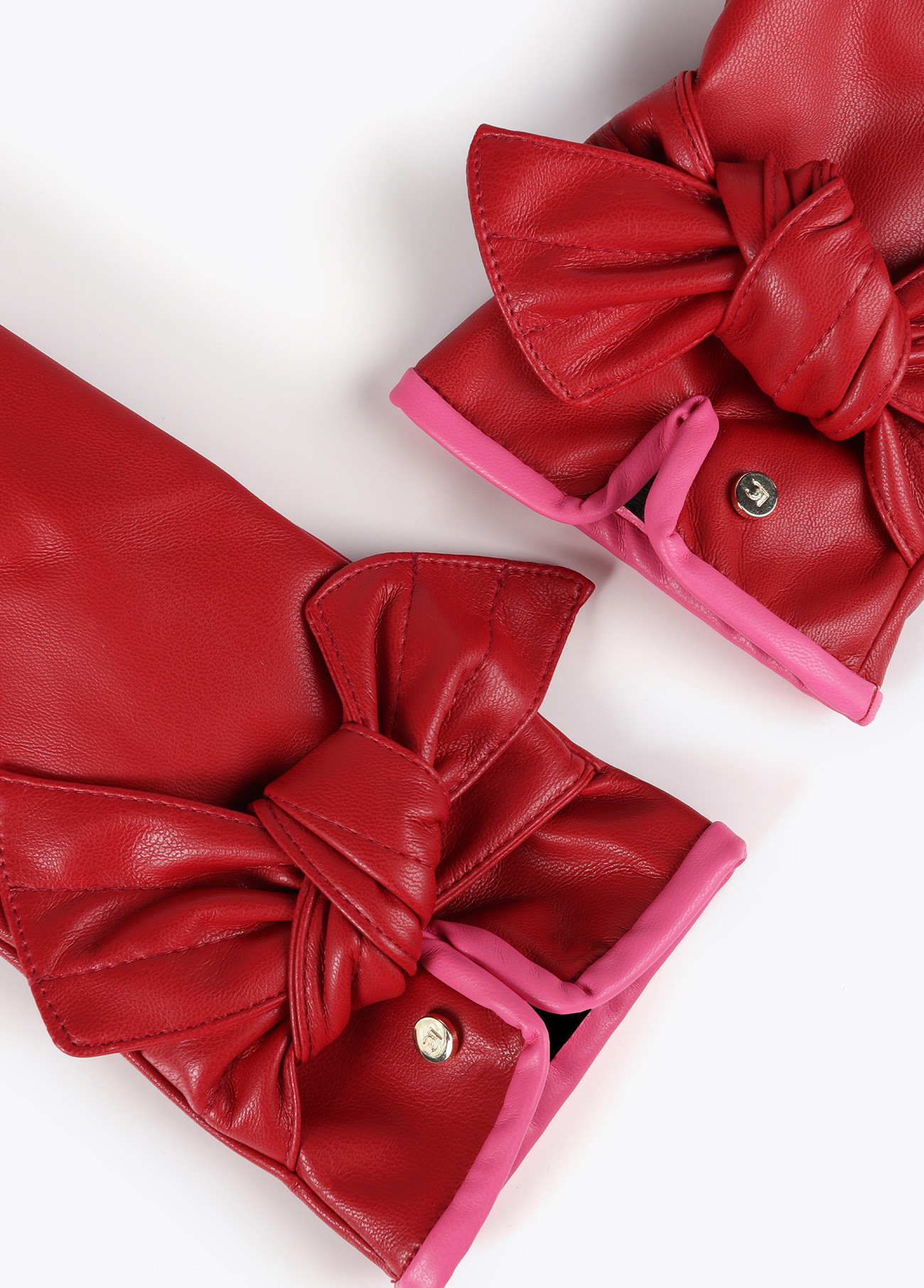 Gants élégants en cuir synthétique de couleur rouge vif. Intemporels et sophistiqués, avec un délicat nœud au poignet. Intérieur doux pour plus de confort. Fermoir métallique subtil.