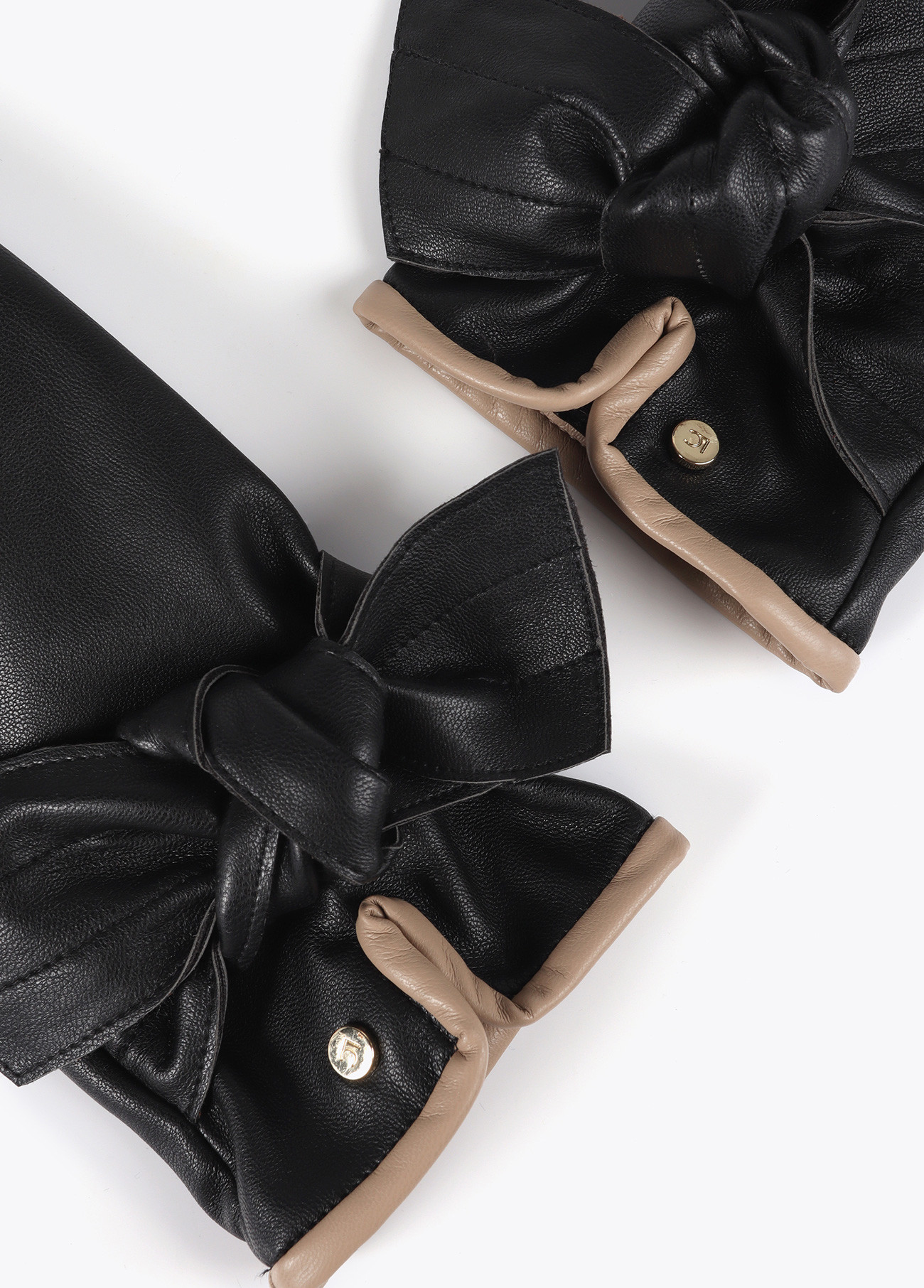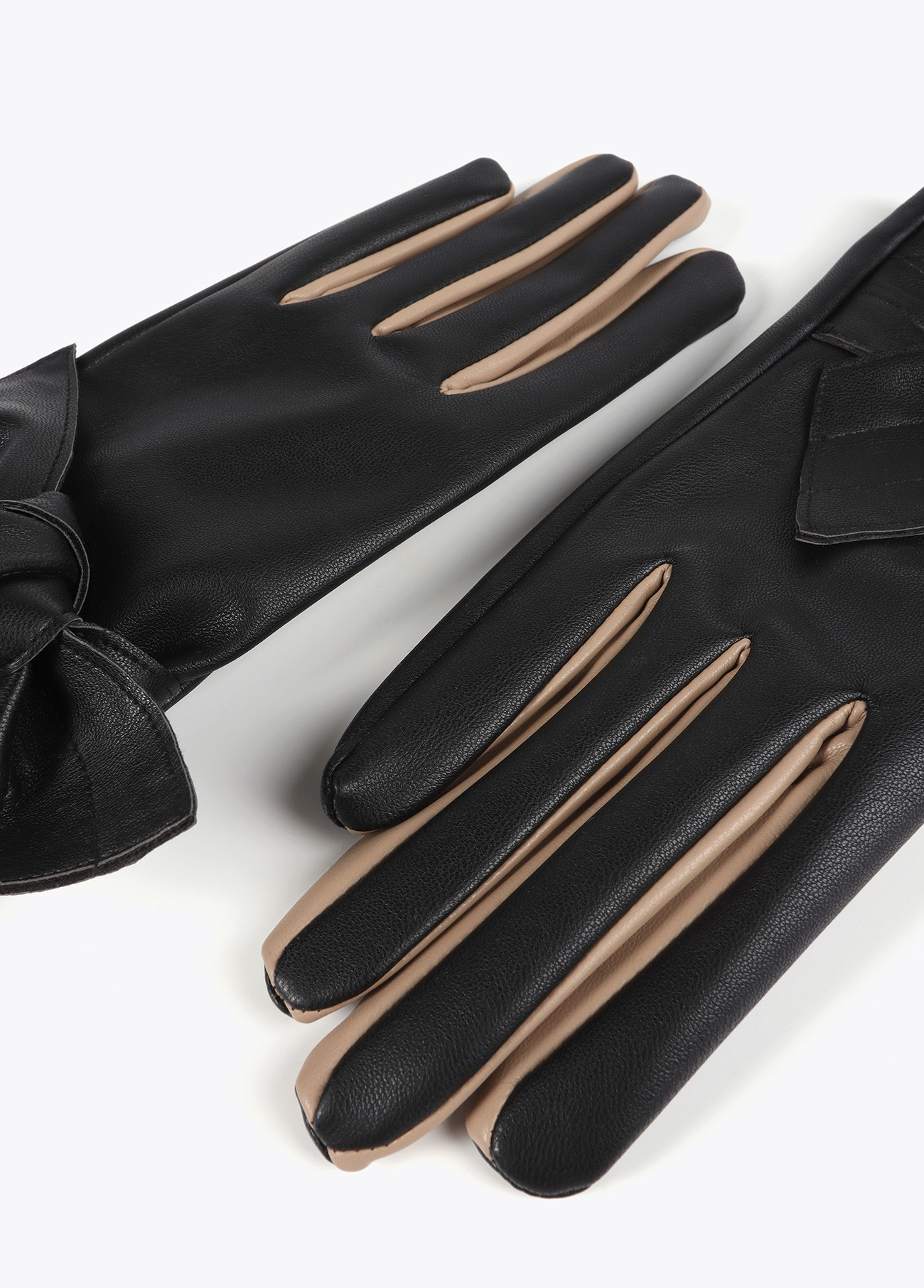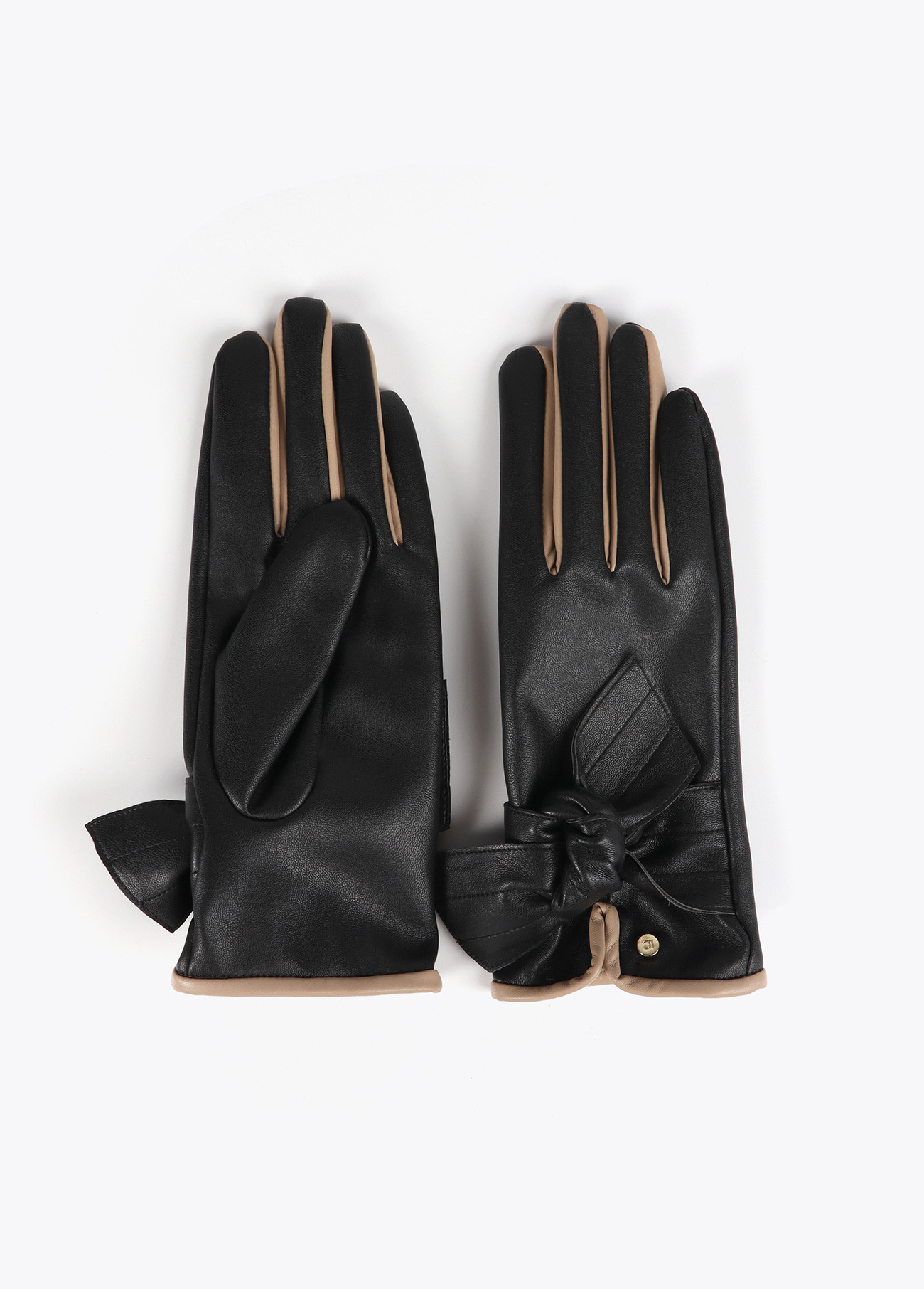 Gants élégants en effet cuir avec un détail de nœud au poignet. Intérieur doux et doublé pour plus de confort. Fermeture facile avec bouton doré. Parfait pour un look sophistiqué lors des journées fraîches.