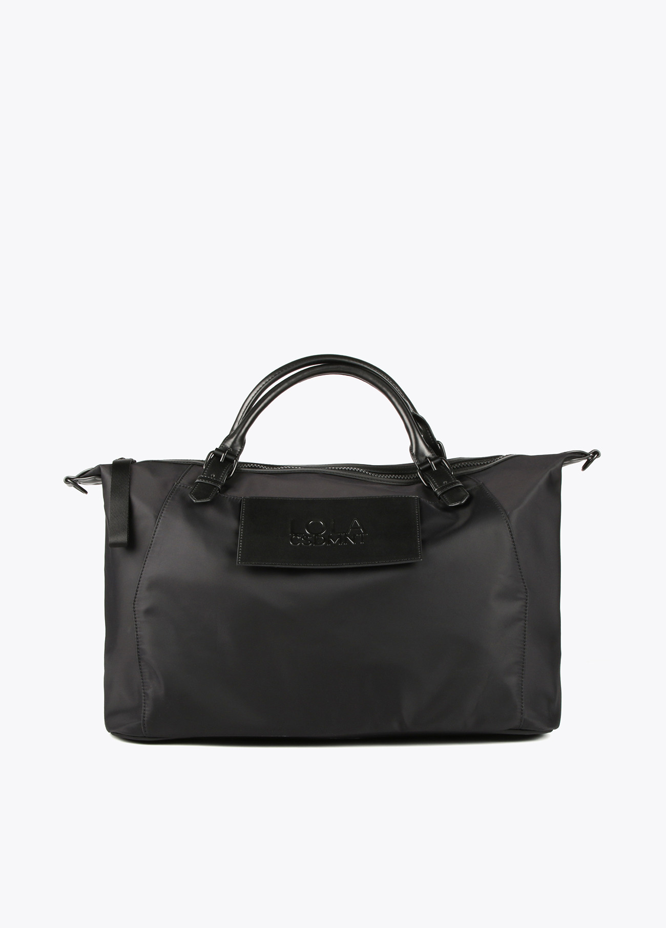 Sac weekend noir en nylon avec effet cuir. Avec poche avant avec logo, poignées et bandoulière logotée. Fermeture à glissière avec compartiments intérieurs pratiques. Dimensions : 22,5cm x 19,5cm x 45cm.