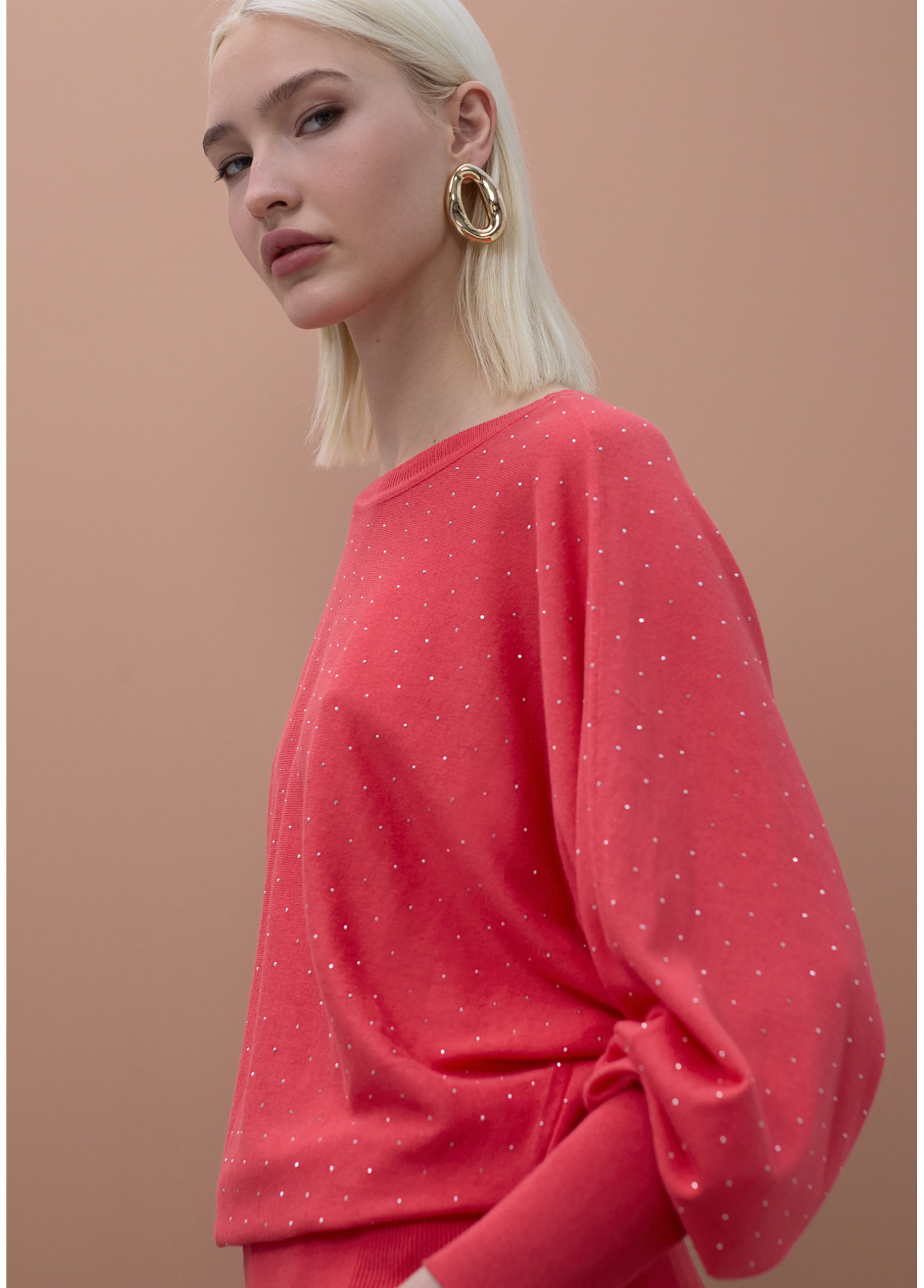 Pull élégant avec manches chauve-souris et détails de strass. Confectionné en tissu doux de haute qualité pour un toucher agréable. Parfait pour rehausser n'importe quel look quotidien avec une touche d'éclat.
