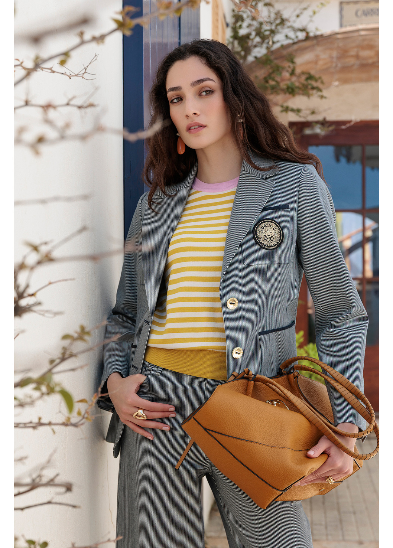 Blazer ajusté avec motif à rayures élégant et écusson brodé distinctif sur la poche. Parfait pour un look sophistiqué et moderne. Fabriqué avec des matériaux de haute qualité pour le confort et le style durable.
