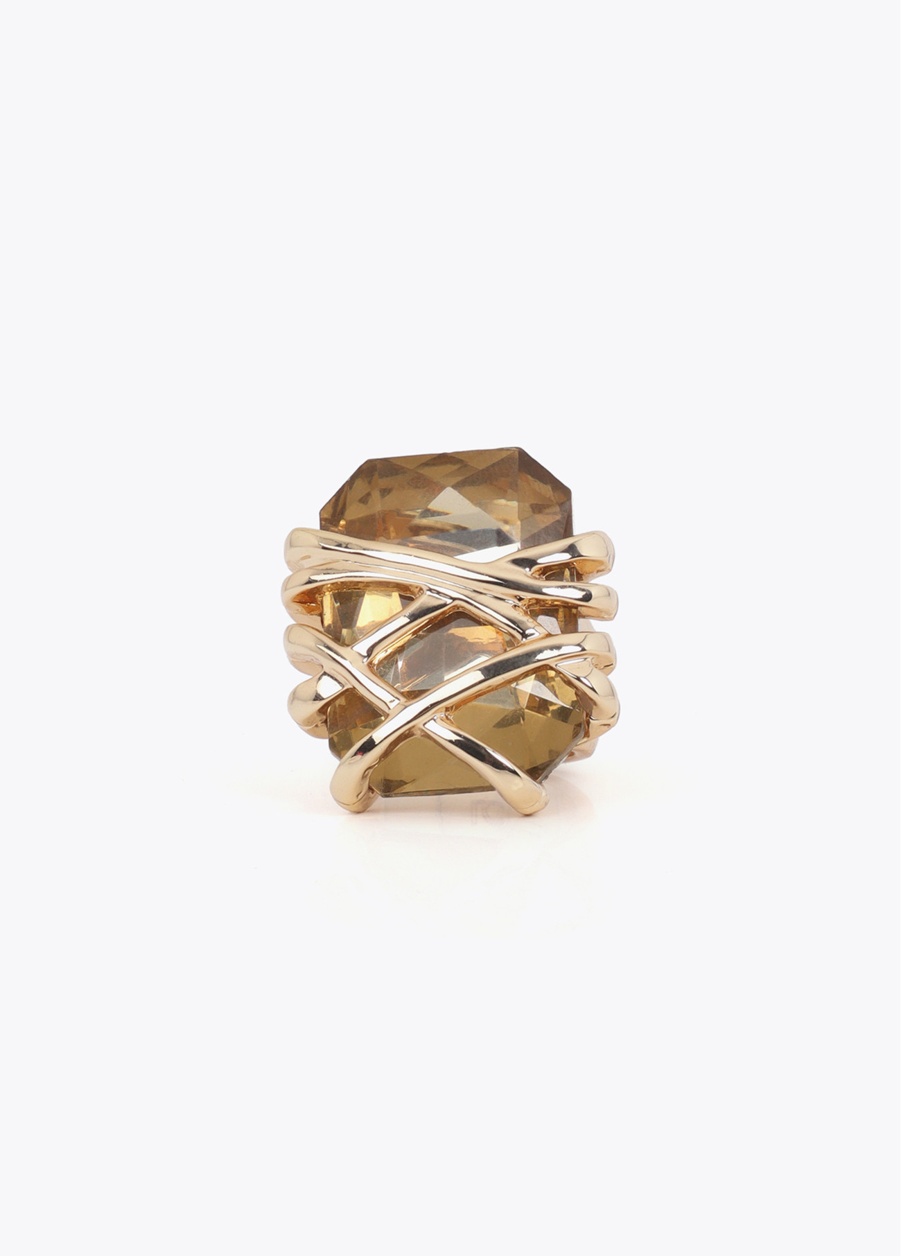 Superbe bague maxi avec un grand cristal facetté et des détails métalliques dorés. Design enveloppant qui se distingue en toute occasion. Accessoire de mode audacieux et sophistiqué.