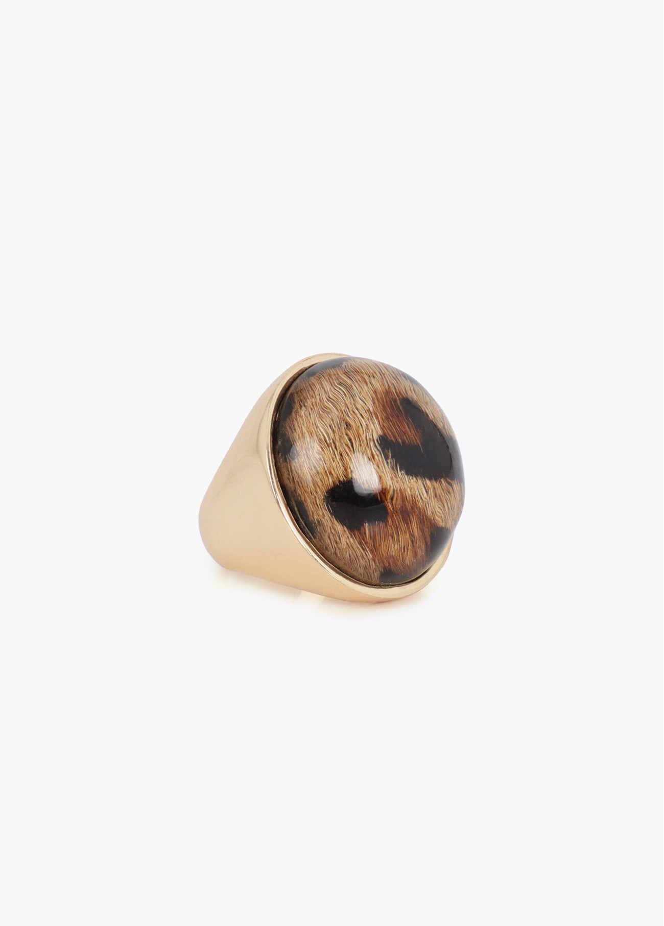 Bague en métal doré élégante avec un design imprimé animal sur le dessus. Un accessoire moderne et sophistiqué pour n'importe quel look. Finition de haute qualité qui ajoute une touche de glamour exubérant.