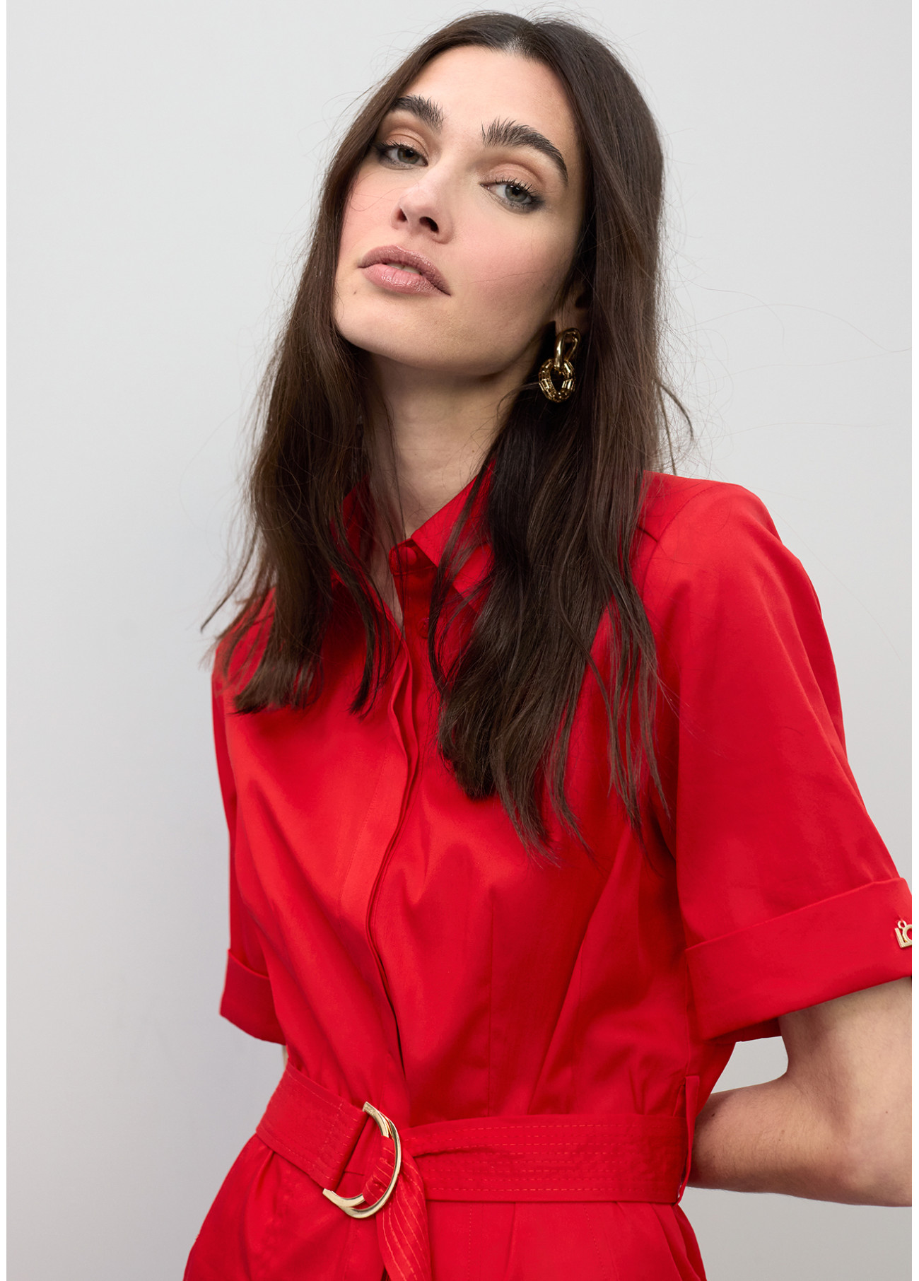 Robe midi avec jupe évasée en tissu léger. Comprend une ceinture ajustable pour une taille définie et des manches courtes. Parfaite pour un look décontracté et sophistiqué lors des journées de printemps et d'été. Détails de couture au col et aux poignets.